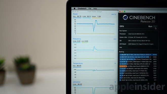 Redaktoři serveru Appleinsider k testu využili populární benchmark Cinebench R20. Místo jednoho průběhu benchmarku však test spouštěli neustále po sobě, aby tak simulovali dlouhodobé zatížení procesoru.
