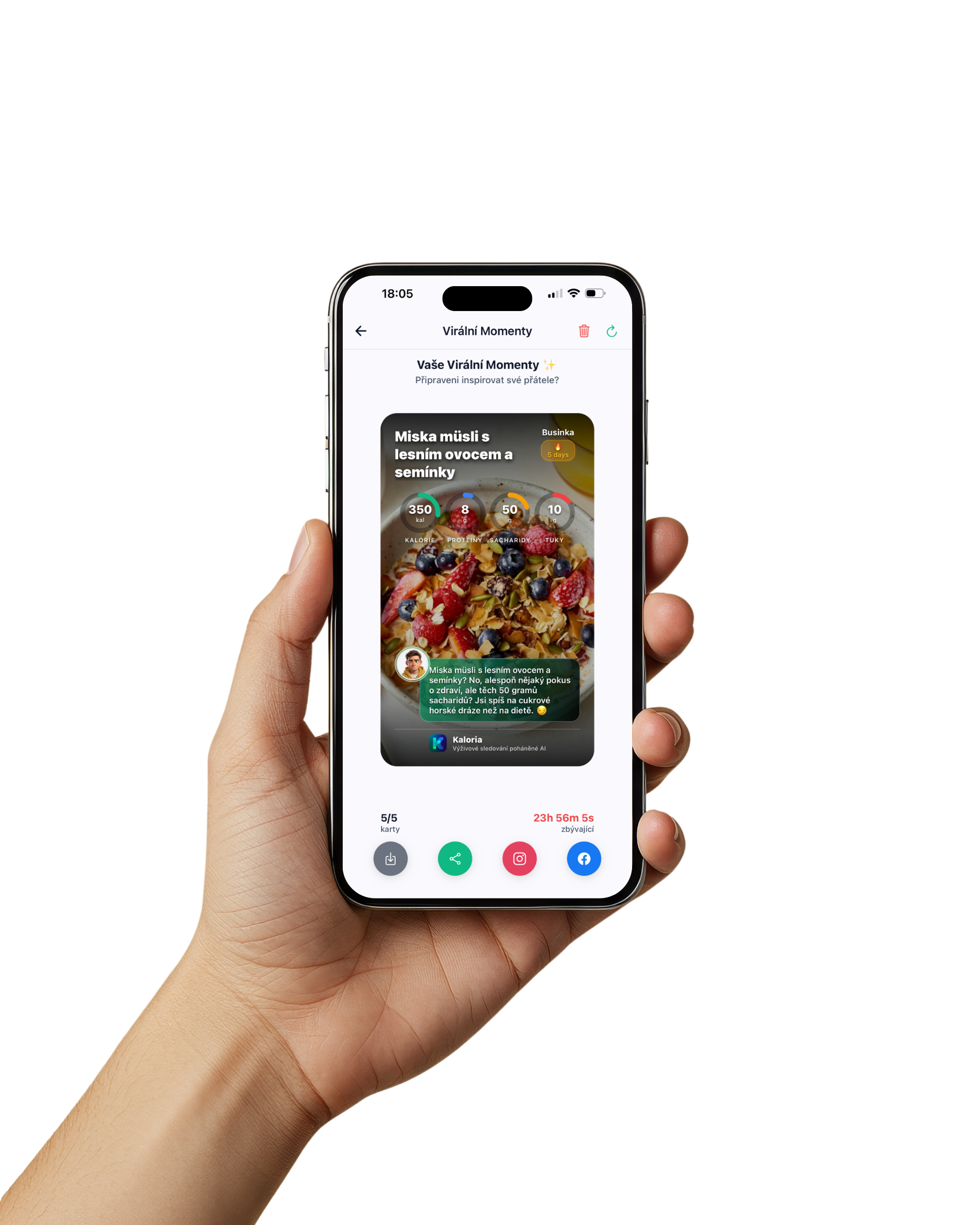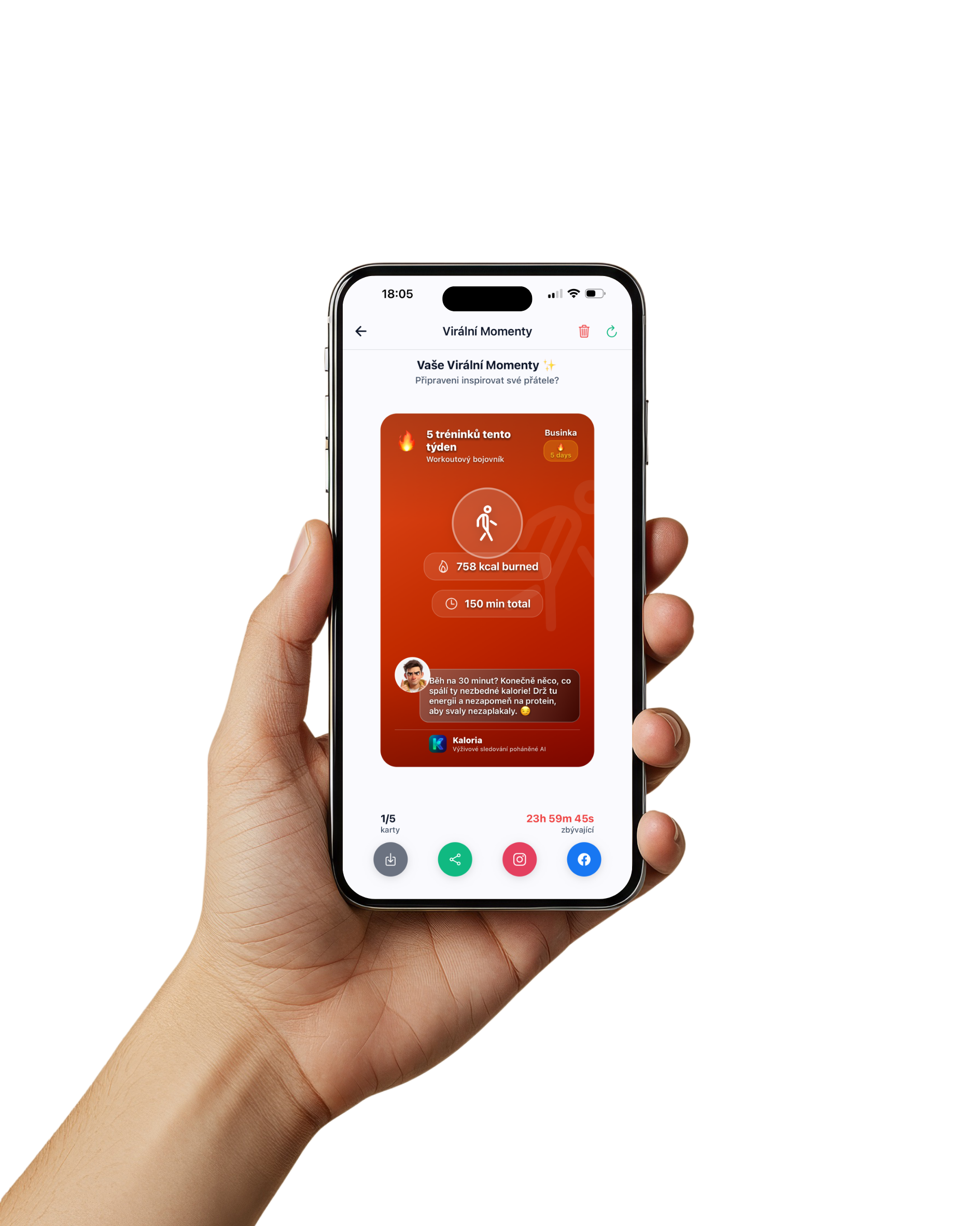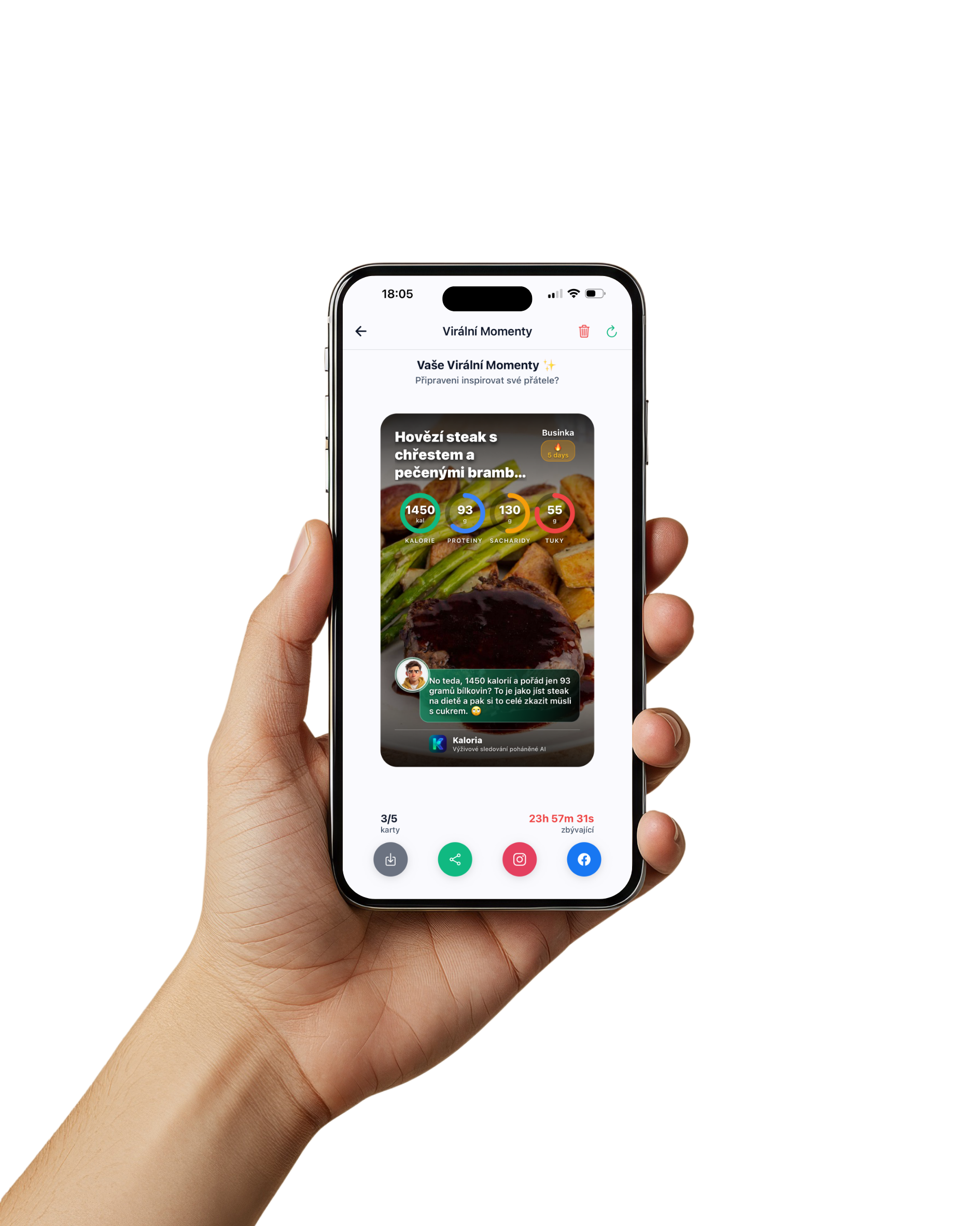Za zmínku pak stojí i drobný, ale vlastně velmi chytrý detail v podobě takzvaných virálních kartiček. Aplikace je dokáže vygenerovat například po vyfocení jídla nebo dosažení určitého milníku, ať už jde o konzistenci, splněný fitness cíl nebo jiný posun vpřed. Výsledkem je vizuálně atraktivní kartička s fotkou jídla či zachyceným úspěchem, doplněná o přehledné informace, jako jsou makra nebo komentář kouče, kterou lze jedním klepnutím sdílet na sociálních sítích. Kartičky jsou dostupné přes ikonu v horní liště aplikace a hezky zapadají do celkové filozofie motivovat uživatele k pravidelnosti i sdílení vlastního progresu.