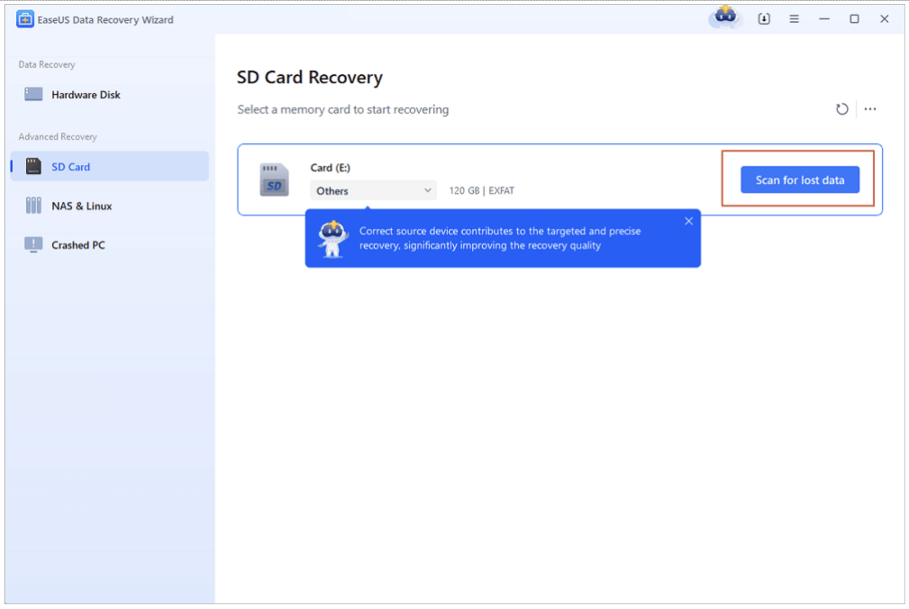 Klikněte na „Skenovat pro ztracená data“ a začněte skenovat SD kartu Olympus.