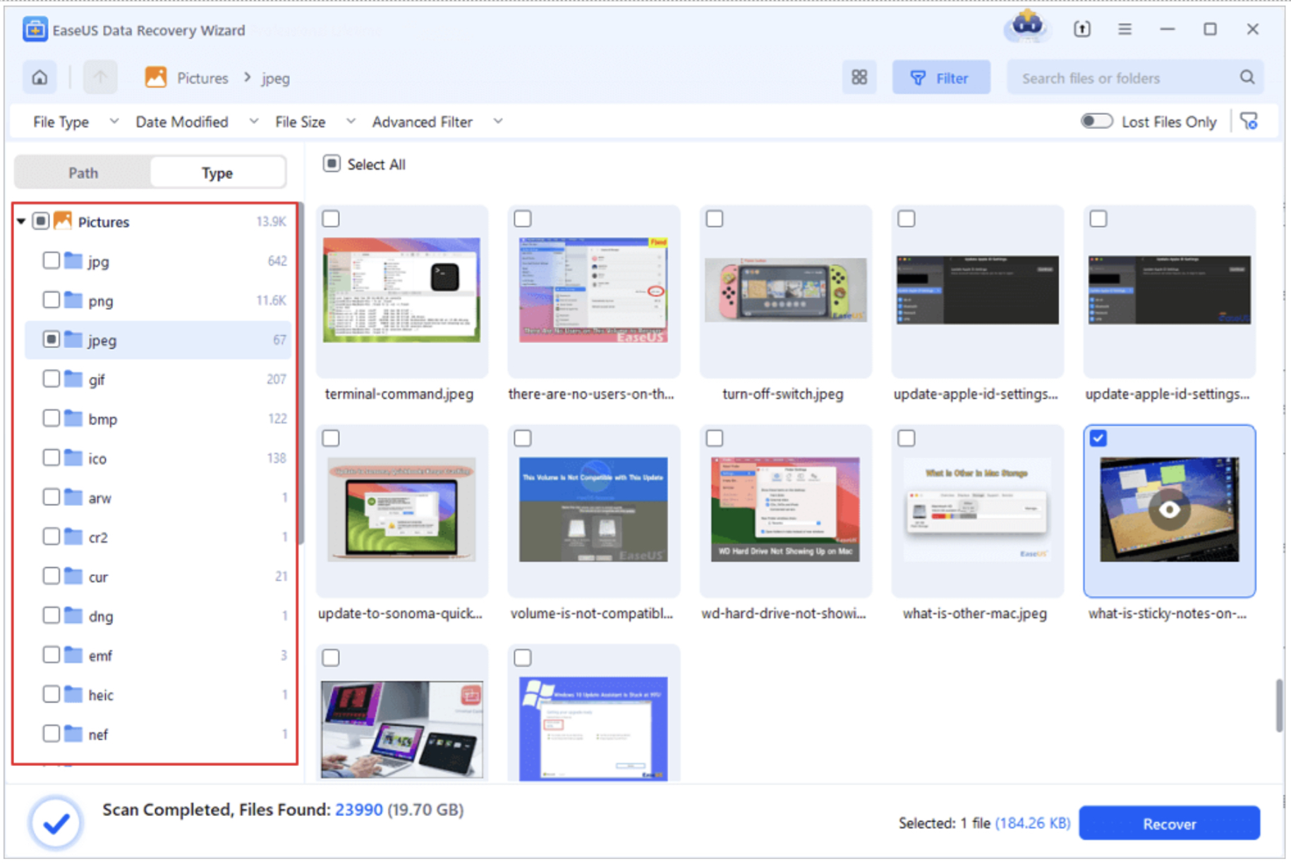 Klikněte na „Typ“ > „Obrázky“, abyste našli smazané fotografie z digitálního fotoaparátu Olympus. Tento software vám může pomoci snadno provést obnovu RAW fotografií a také může obnovit smazané formáty JPG, JPEG, PNG a další běžné formáty.