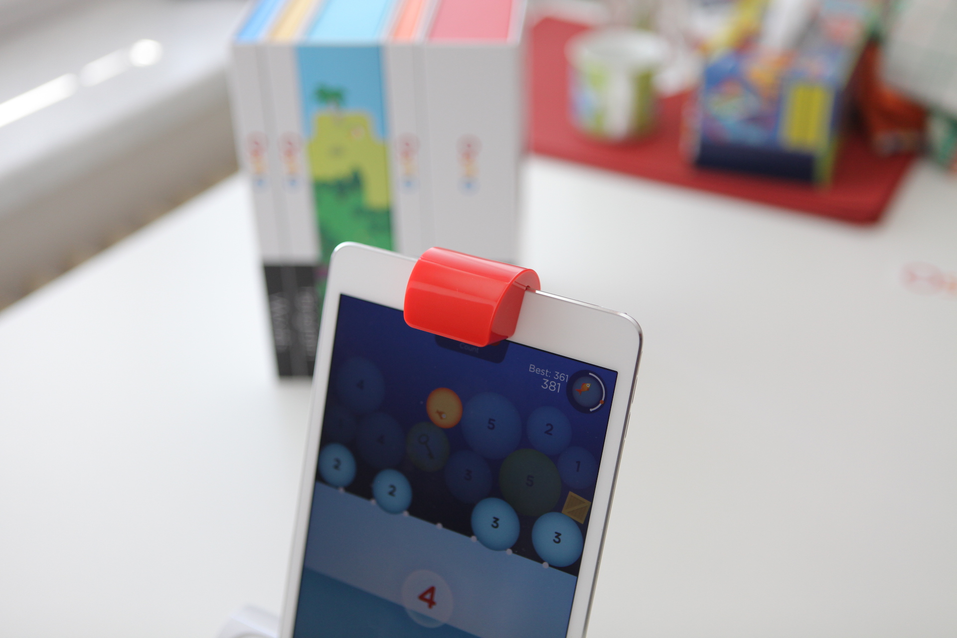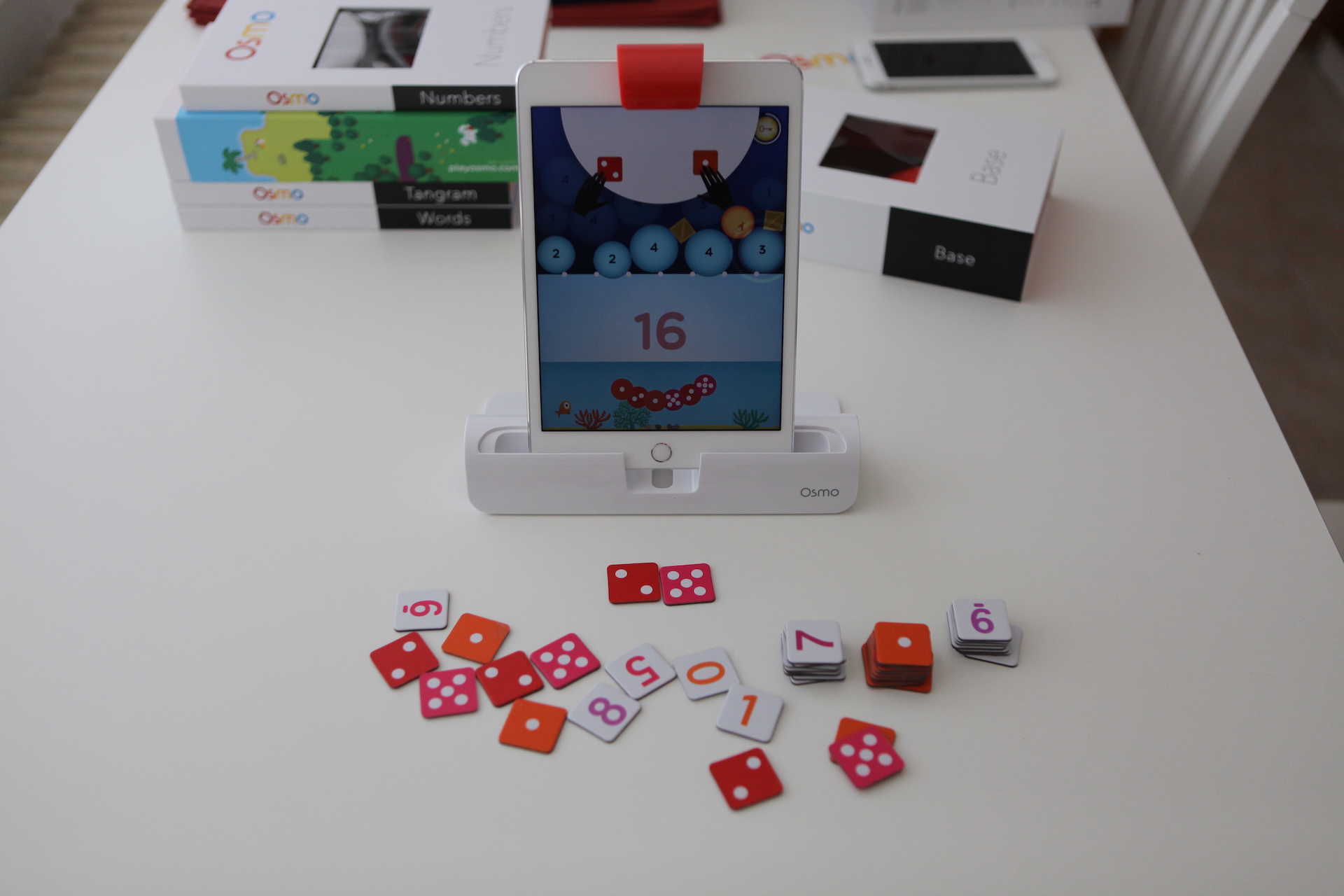 Vyzkoušel jsem také aplikaci Osmo Numbers. Opět jsem si na stůl vyndal číslice a tečky, stáhl aplikaci a spustil. Vtip je v tom, že musíte sestavovat z teček různá čísla a z nich celé úrovně. Na obrazovce je například podmořský svět, kde jsou bubliny s čísly. Jakmile příslušné číslo dáte pod iPad, z displeje zmizí.
