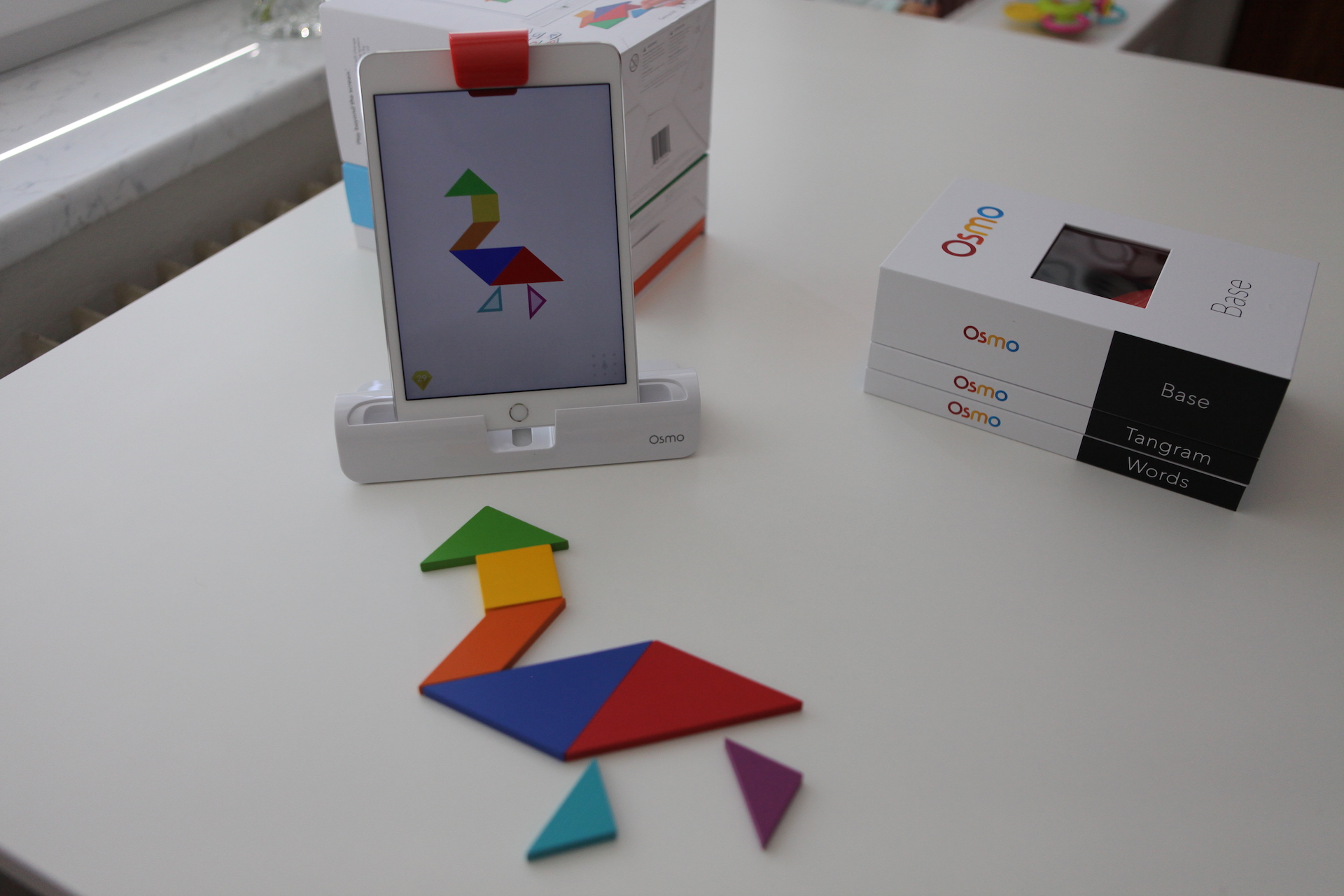 Já jsem otestoval Tangram, Numbers a Words. Nejvíce ze všeho se mi asi líbil Tangram. Jde o hlavolam, který pochází ze staré Číny a hrál jsem si s ním již jako malý kluk. Tvoří ho sedm geometrických tvarů, ze nichž lze sestavit spoustu obrázků. Jakmile máte iPad v podstavci a stáhnutou aplikaci Tangram, můžete začít stavět. Cílem hry je sestavit obrázek, u něhož znáte pouze jeho obrys. Na výběr máte z několika obtížností a na začátku vždy přesně vidíte, kam který geometrický útvar patří. Následně však vše můžete nechat zmizet a stavět čistě jen podle obrysu.