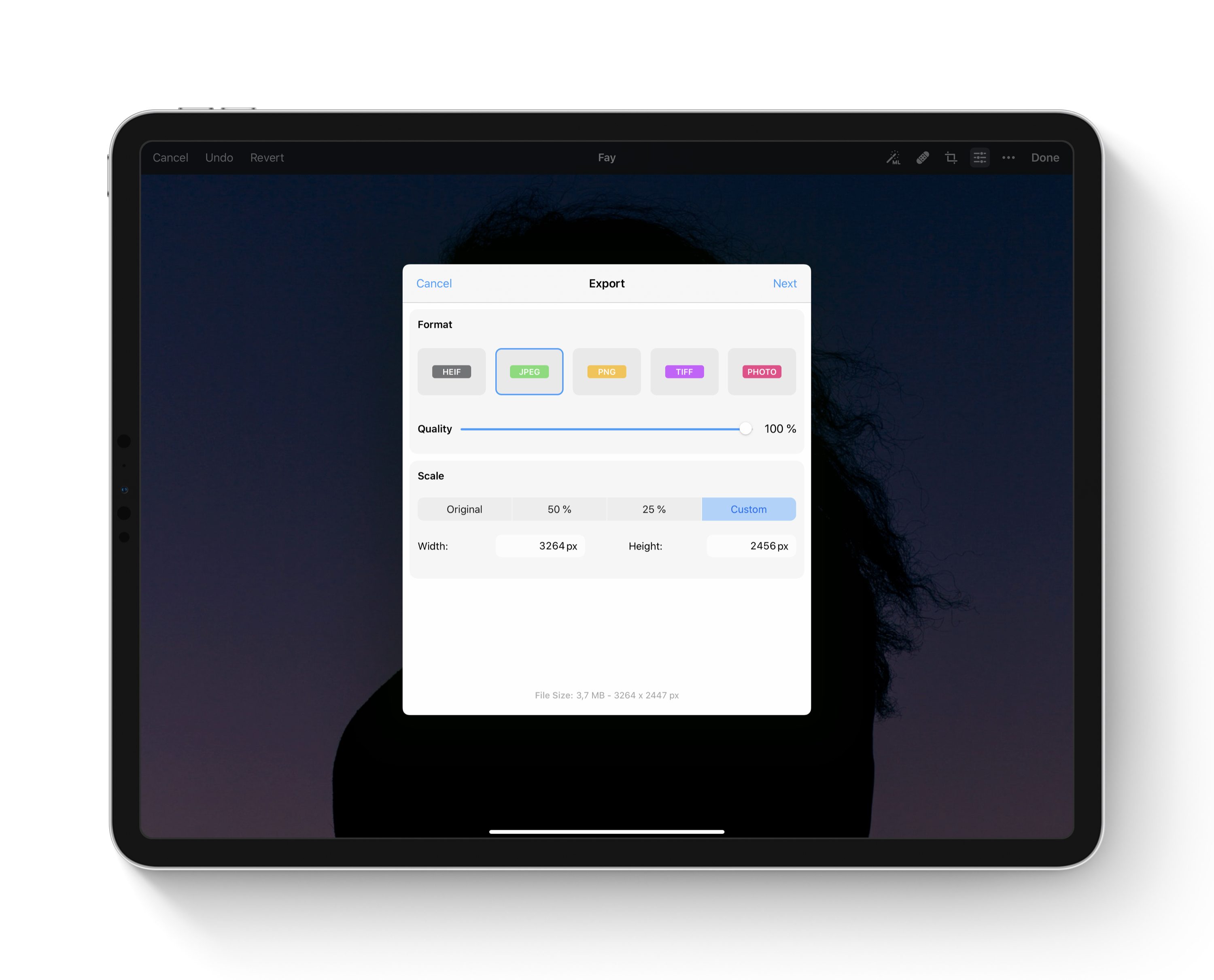 Součástí nové verze aplikace Pixelmator Photo je také přepracovaný panel pro export s možnostmi volby pro formát souborů a rozměry fotografií. V průběhu procesu exportu mají uživatelé možnost změnit měřítko výchozího obrazu a okamžitě sledovat, jak tyto změny ovlivní finální velikost souboru.