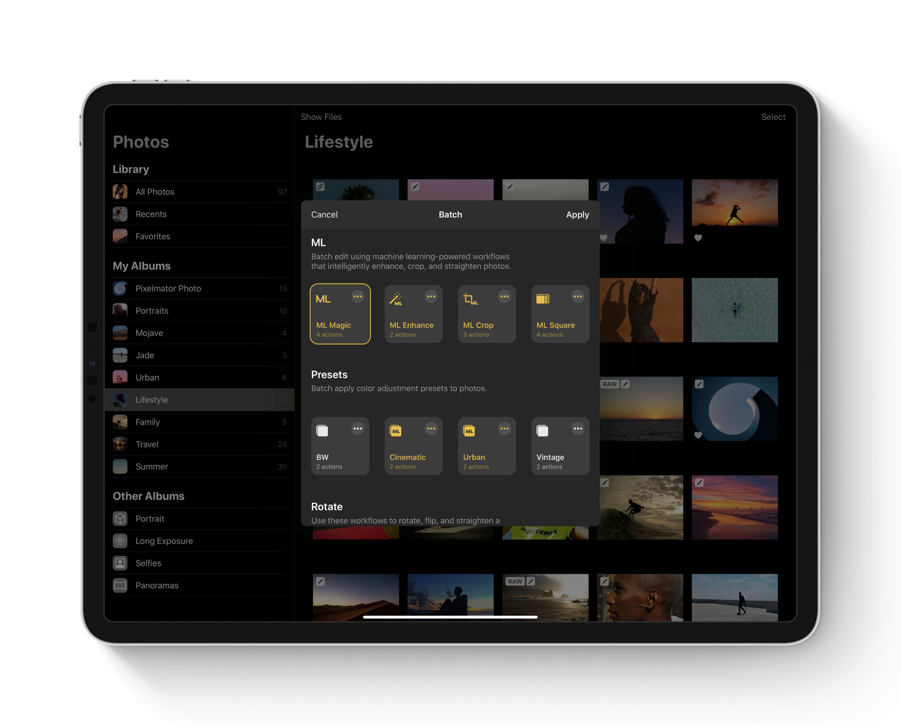 K dávkovým úpravám využívá aplikace Pixelmator Photo nástroje strojového učení, jako je ML Enhance nebo ML Crop, po dávkových úpravách lze přizpůsobení dokončit také ručně. Dávkové pracovní postupy je v aplikaci možné uložit pro pozdější opakované použití.
