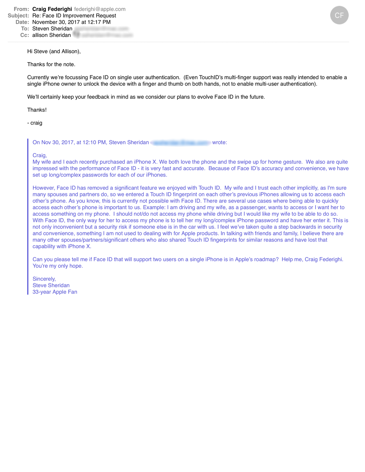 V mailu Federighi uvedl že je možné, že bude někdy v budoucnu Face ID schopné rozpoznat a autorizovat i jiné uživatele, v současné době je to však směr, kterým se vývoj neubírá. V Applu se o podobném kroku vůbec nehovoří a v blízké budoucnosti bychom ho tak neměli očekávat. Celý text mailové korespondence si můžete přečíst na obrázku výše. Původně se s ním pochlubil uživatel redditu, který se zajímal o Face ID a jeho možná vylepšení.