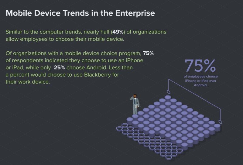 Z těchto vybraných skupin prý 72% zaměstnanců volí počítače od Applu, zatímco 28% z nich sáhne po stroji s Windows. Co se týče mobilních telefonů (a tabletů), zde Apple získal podporu od 75% zaměstnanců, zatímco 25% by sáhlo po zařízení s operačním systémem Android.