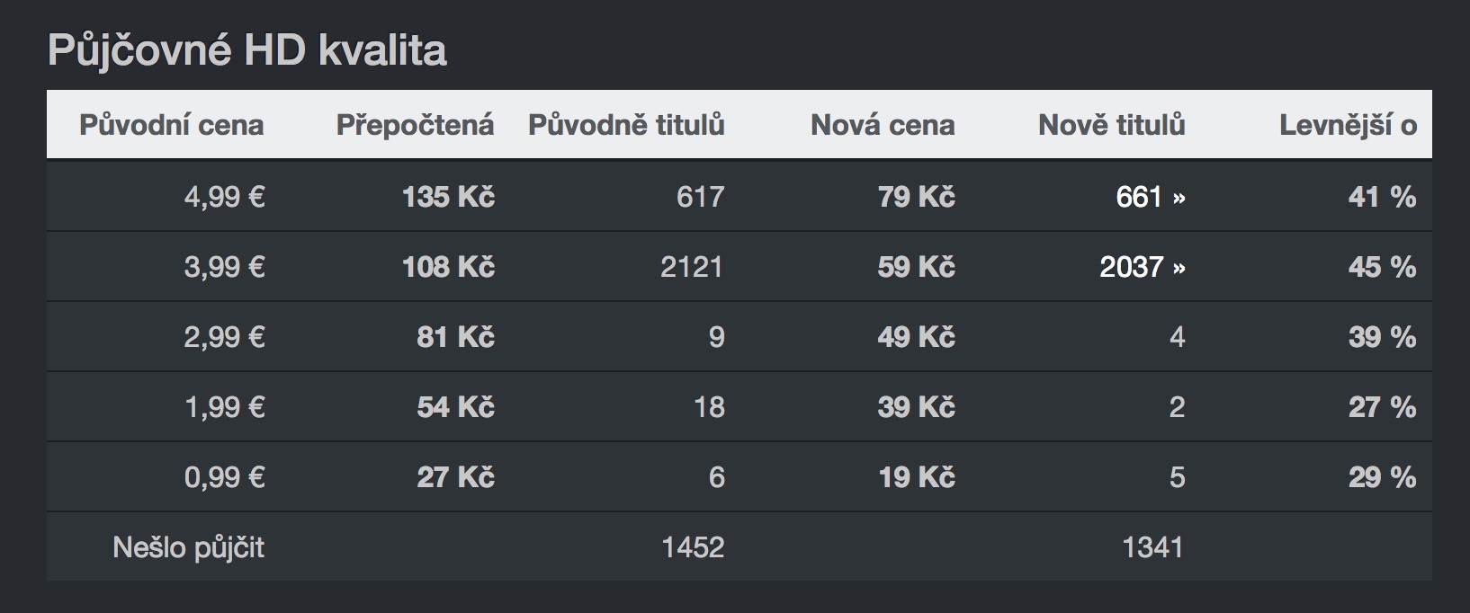 Pokud jsme si chtěli v iTunes půjčovat HD filmy za eura, ještě nedávno nás to stálo až 135 korun (4,99 €). V případě nákupu HD filmu jsme museli zaplatit více než třikrát tolik (16,99 €). Po přechodu na české koruny se ale vše mění, protože pět eur nebylo převedených na zmíněných 135 korun, ale jen na 79 korun, což je téměř poloviční cena.
