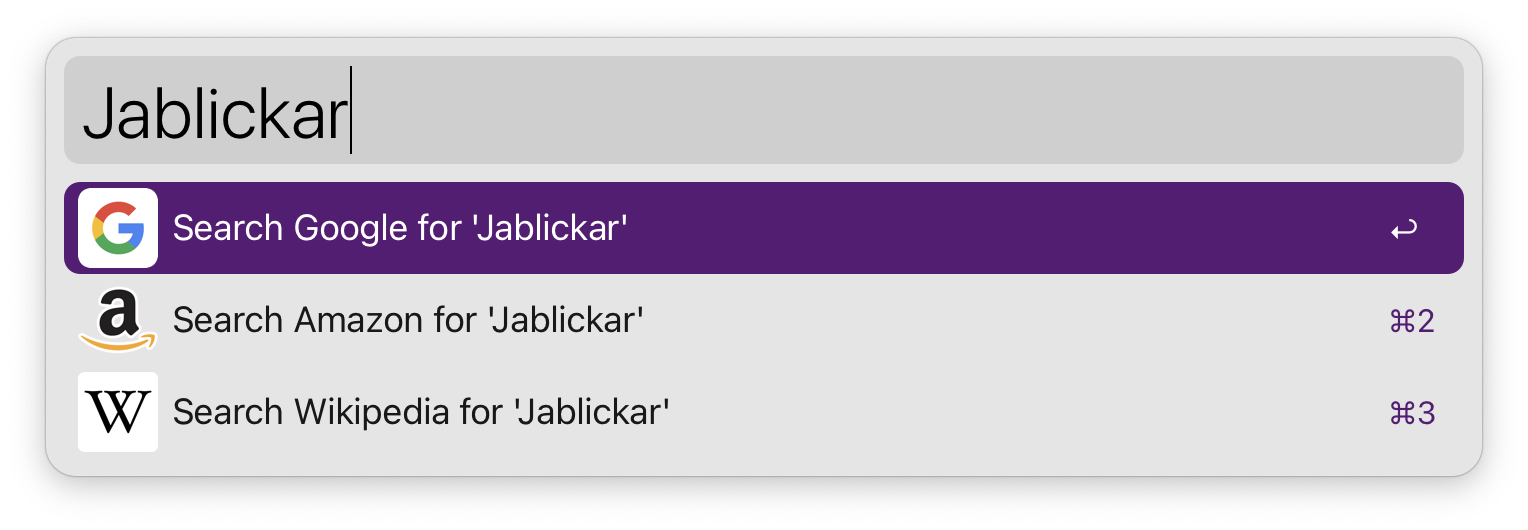 Stejně tak můžeme s Alfredem vyhledávat i v rámci internetu. V takovém případě stačí přímo napsat jakýkoliv dotaz, načež nám vyběhnou tři možnosti – hledat na Googlu, Amazonu, nebo Wikipedii. Ačkoliv jde o drobnost, musím upřímně uznat, že jde o krásné zpříjemnění každodenního vyhledávání na internetu. Program se každopádně i v tomto směru spoléhá na řadu klíčových slov pro zpřesnění našeho vyhledávání. Ačkoliv si tak hravě poradí s okamžitým otevřením Google Maps na dané pozici, prohledání sociálních sítí (Twitter, Facebook), prohledání Gmailu, YouTube, IMDB, Wolfram a podobně.