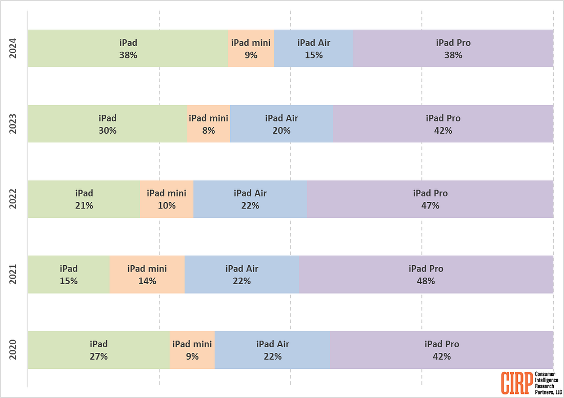 - Rok 2024: Nárůst na 38 % a vyrovnání podílu iPadu Pro