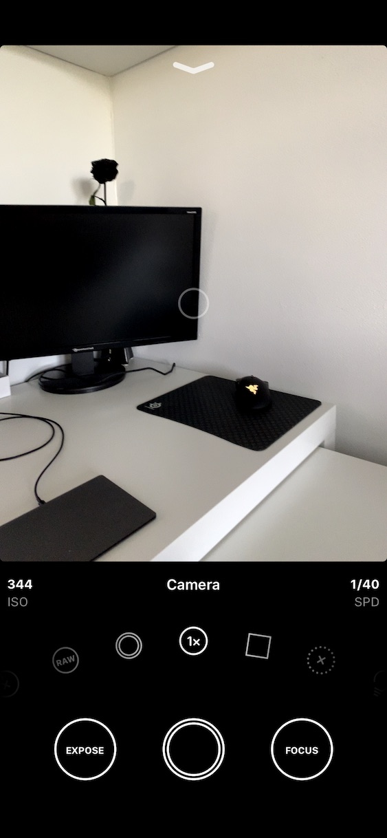 Pod výše zmíněným kolečkem s funkcemi se nachází celkem tři velké kruhy. Prostřední z nich slouží samozřejmě jakožto závěrka. Kruh napravo s nápisem Focus slouží k nastavení zaostření vašeho fotoaparátu. Zde přichází velký rozdíl oproti nativní aplikaci Fotoaparát – v Obscuře lze totiž ostřit úplně manuálně. Pokud kruh Focus rozkliknete, tak se vám zobrazí posuvník, díky kterému může ručně ostřit. Pokud chcete, aby fotoaparát začal opět ostři automaticky, tak vpravo nahoře klepněte na A se šipkou v kruhu. Naprosto stejně to funguje i v případě nastavení expozice – stačí klepnout na Expose vlevo dole. Opět stačí posuvníkem hodnotu expozice manuálně nastavit, pokud chcete nastavení resetovat, tak klepněte na A se šipkou v kruhu.