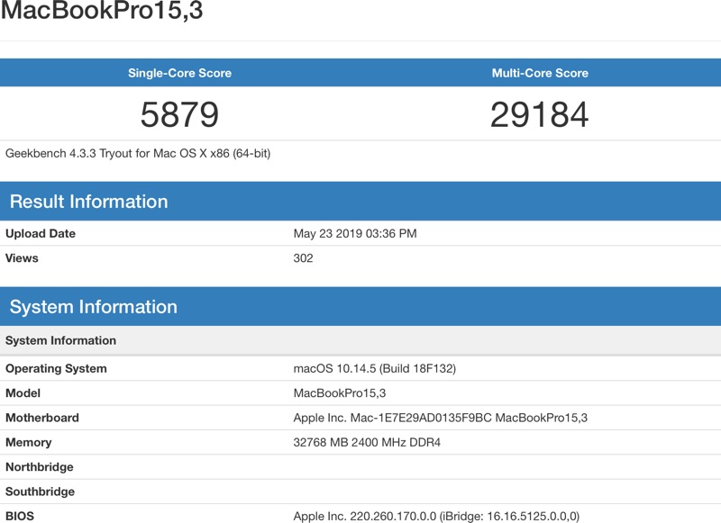 Jako první se na webu objevily výsledky benchmarku Geekbench. V něm si nový 15″ MacBook Pro ve vrcholné konfiguraci připsal 5 879 bodů v jednovláknovém testu a 29 148 bodů ve vícevláknovém testu. V porovnání s předchozí vrcholnou konfigurací 15″ MacBooku Pro tak jde o navýšení skóre o 10, resp. 29%. Tyto výsledky je však třeba brát se značnou rezervou.