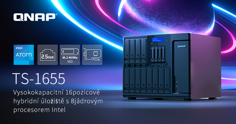 Tisková zpráva: Společnost QNAP® Systems, Inc., přední inovátor v oblasti výpočetních, síťových a úložných řešení, představila vysokokapacitní stolní 2,5GbE NAS TS-1655, který pojme dvanáct 3,5” pevných disků a čtyři 2,5” SSD disky. Model TS-1655 je navržen s hybridní úložnou architekturou, která nabízí vyvážený poměr mezi výkonem a cenou, a zahrnuje 8jádrový výpočetní výkon, vysokou rychlost díky rozhraní 2,5GbE a možnost rozšíření přes PCIe pro zvýšení efektivity při sdílení souborů mezi týmy, spolupráci, zálohování, obnově dat po havárii a virtualizaci.