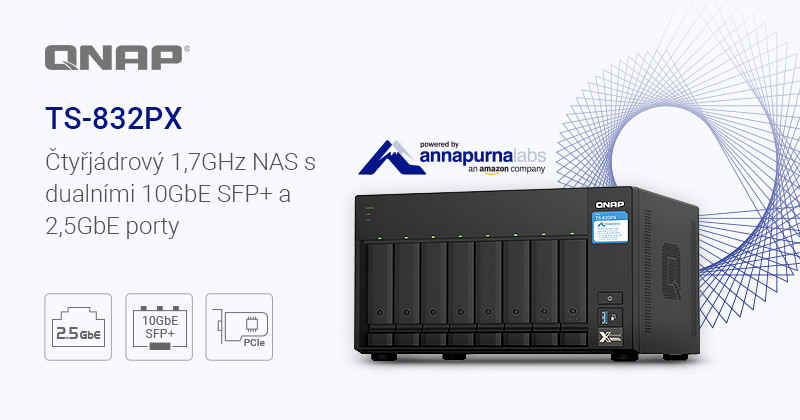• TS-832PX-4G: 8 pozicový stolní model; rychlovýměnné diskové pozice 3,5″ SATA 6Gb/s; čtyřjádrový procesor Annapurna Labs AL324 1,7GHz, 1x slot SODIMM DDR4 se 4GB RAM (podporuje až 16 GB); 2 x porty 10GbE SFP+, 2 x porty 2,5GbE (2,5G/1G/100M) RJ45; slot PCIe Gen2 x2; 3 x porty USB 3.2 Gen 1
