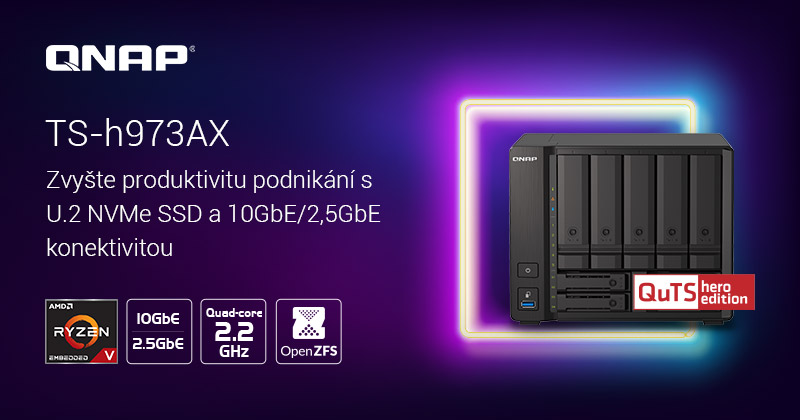 Tisková zpráva: Společnost QNAP® Systems, Inc., přední inovátor v oblasti výpočetních, síťových a úložných řešení, dnes představila QuTS hero NAS TS-h973AX se čtyřjádrovým procesorem AMD Ryzen™ V1500B 2,2 GHz řady V1000 a konektivitou 10GbE/2.5GbE. Má čtyři 2,5″ SSD sloty – přičemž dva sloty podporují jak vysoce výkonné 32Gb/s disky U.2 NVMe PCIe Gen 3 x4 SSD, tak i ekonomické SATA 6Gb/s SSD pro práci s aplikacemi vyžadujícími tu nejnižší možnou latenci. Díky operačnímu systému QuTS hero na bázi ZFS poskytuje model TS-h973AX klíčové podnikové funkce a až petabajtovou kapacitu u každé sdílené složky, a poskytuje tak vysoce výkonné, ale zároveň cenově dostupné řešení NAS.