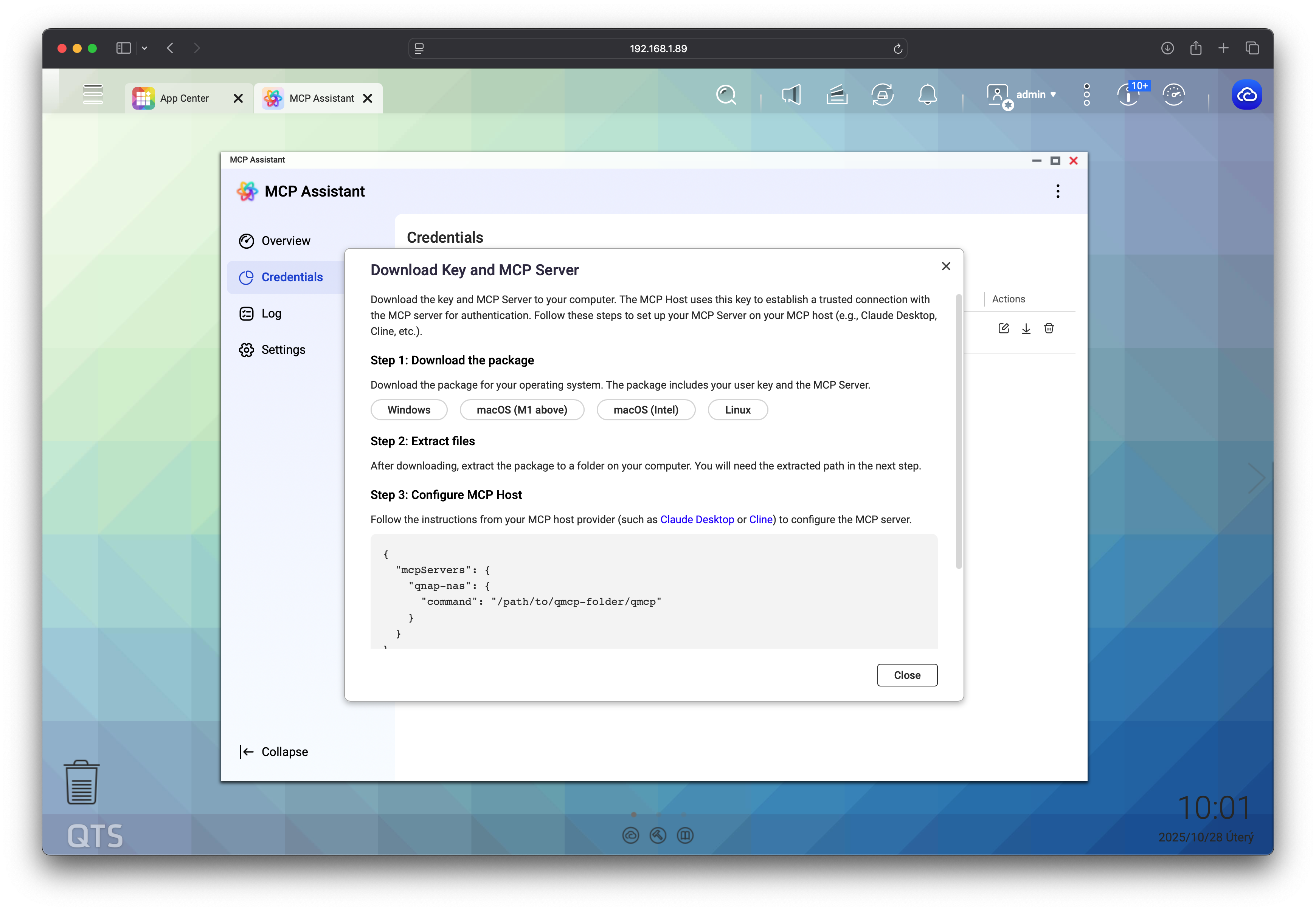 • Stáhněte vygenerovaný přístupový balíček (ZIP soubor), který obsahuje vše potřebné pro napojení Claude Desktop na NAS. Pro účely tohoto návodu byl použit balíček pro Mac s čipy M1 a novějšími.