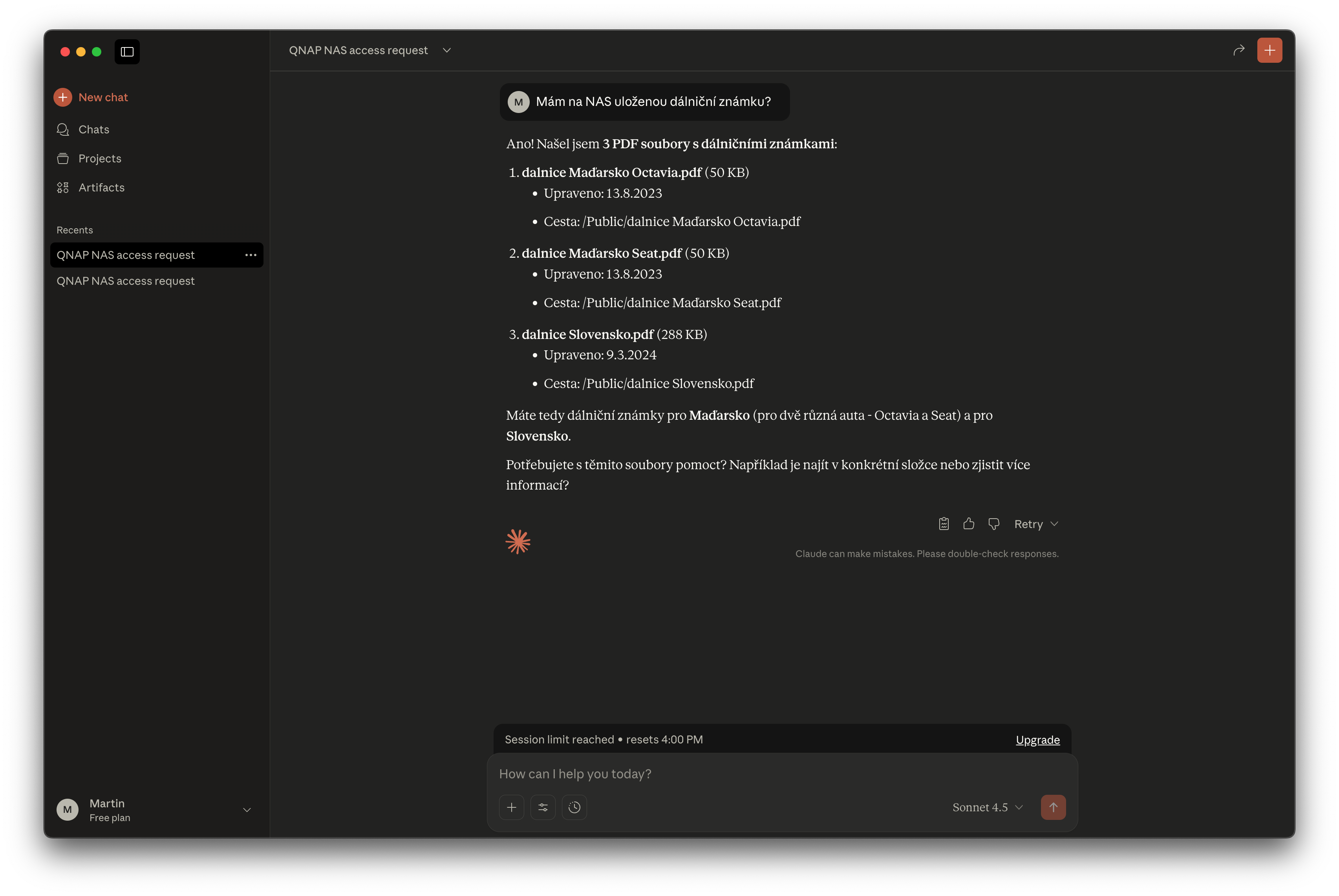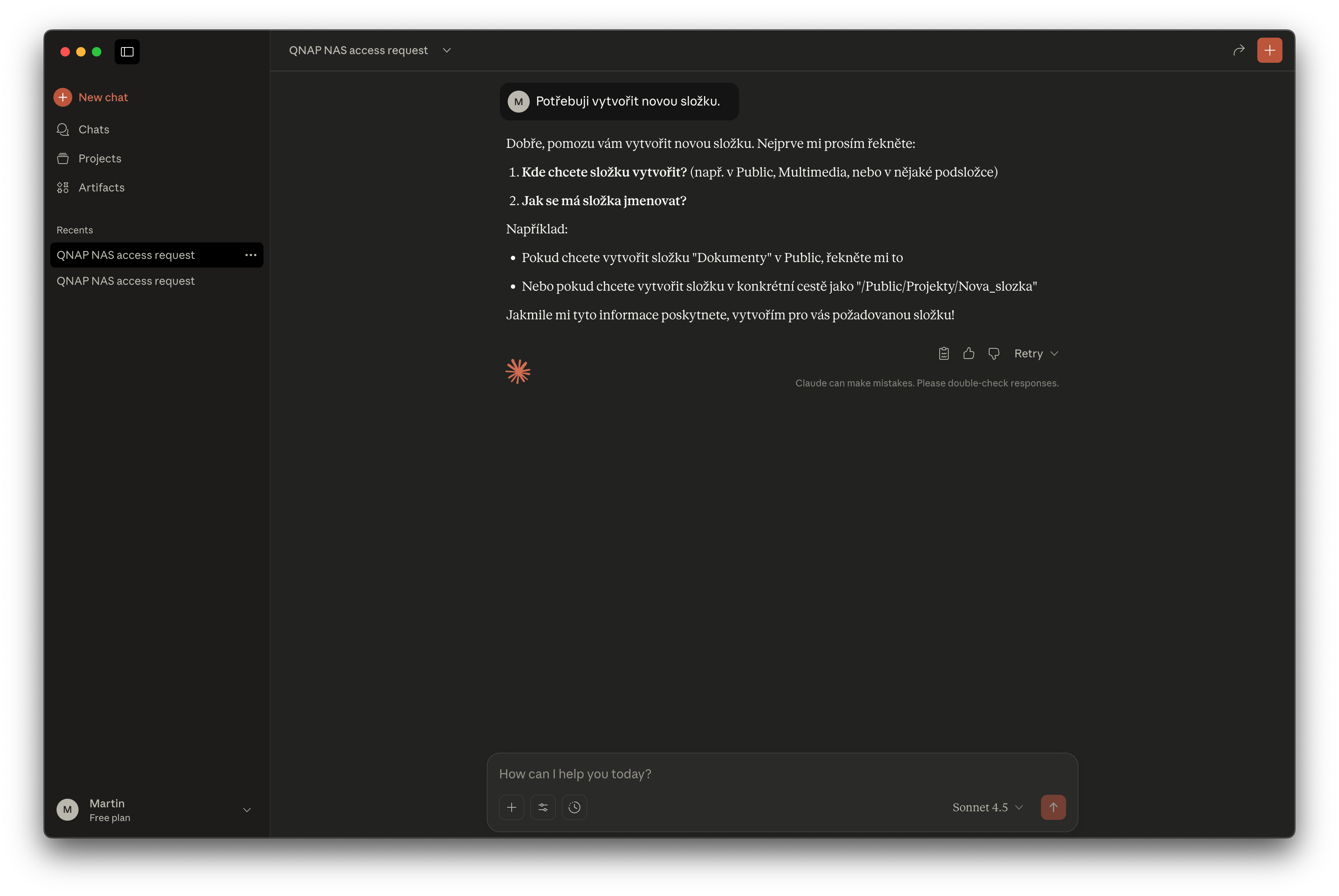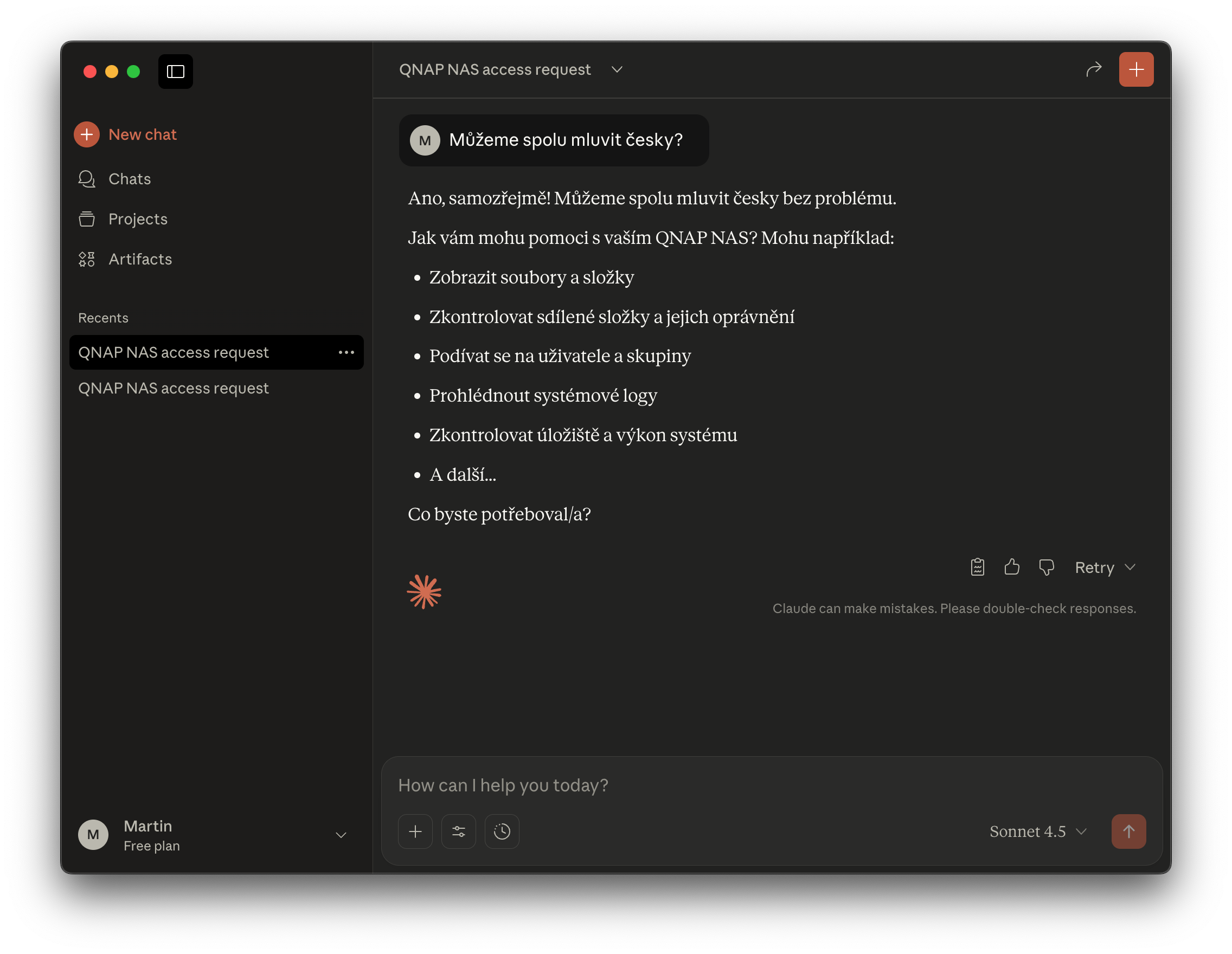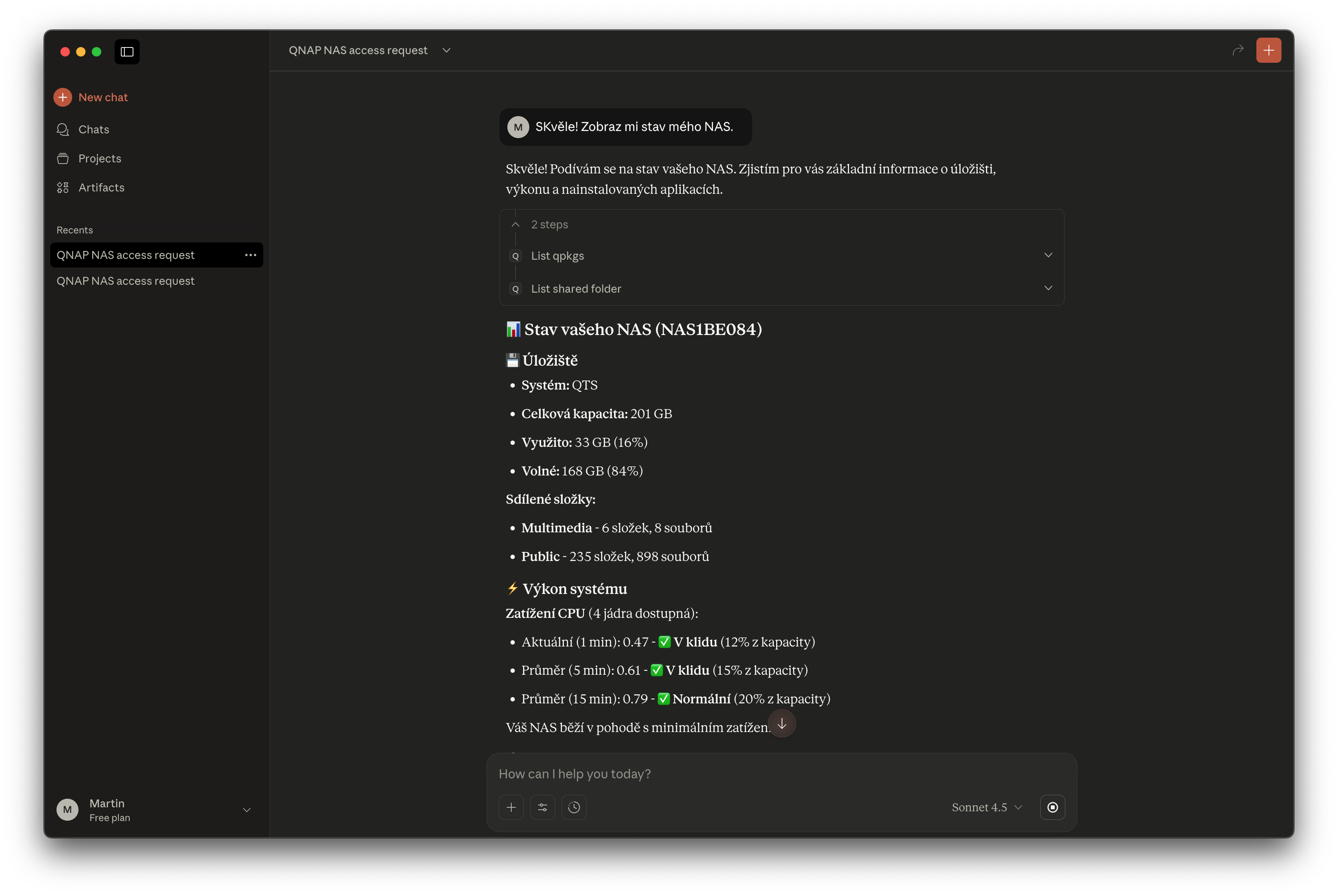 Po nastavení je nutné aplikaci restartovat a případně jí úplně vypnout i v Monitoru aktivity. Pokud jste vše udělali podle návodu, NAS se propojí s Claude desktop aplikací a můžete začít zadávat úkoly.