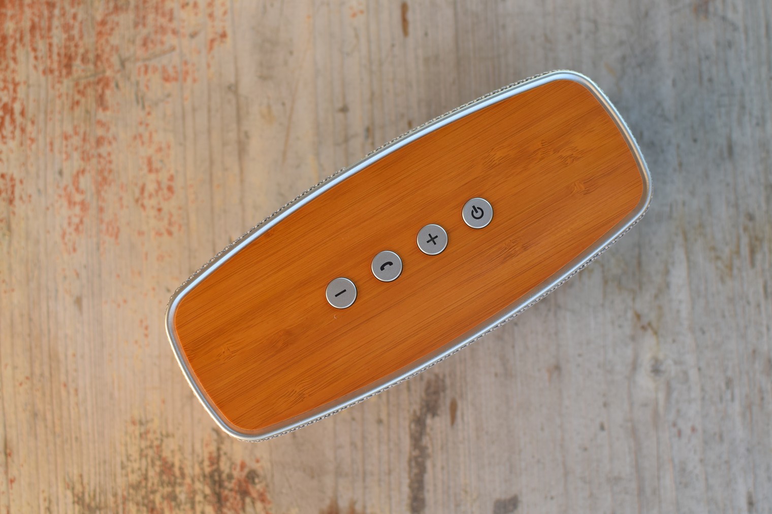 Horní stranu reproduktoru tvoří bambusová “destička”, která dodává celku punc luxusu. Tělo je pak opleteno na dotyk velmi příjemnou tkaninou, která může z dálky působit na pohled spíše jako hliník – tedy minimálně u mnou testované šedé verze. Tělo a ovládací tlačítka jsou pak tvořeny odolným plastem, který však máte možnost vidět de facto jen lehce ze shora, zezadu a zespodu, na kterém naleznete i protiskluzové plošky. Rozhodně se tedy nemusíte bát, že by dojem z reproduktoru jakkoliv pokazil.