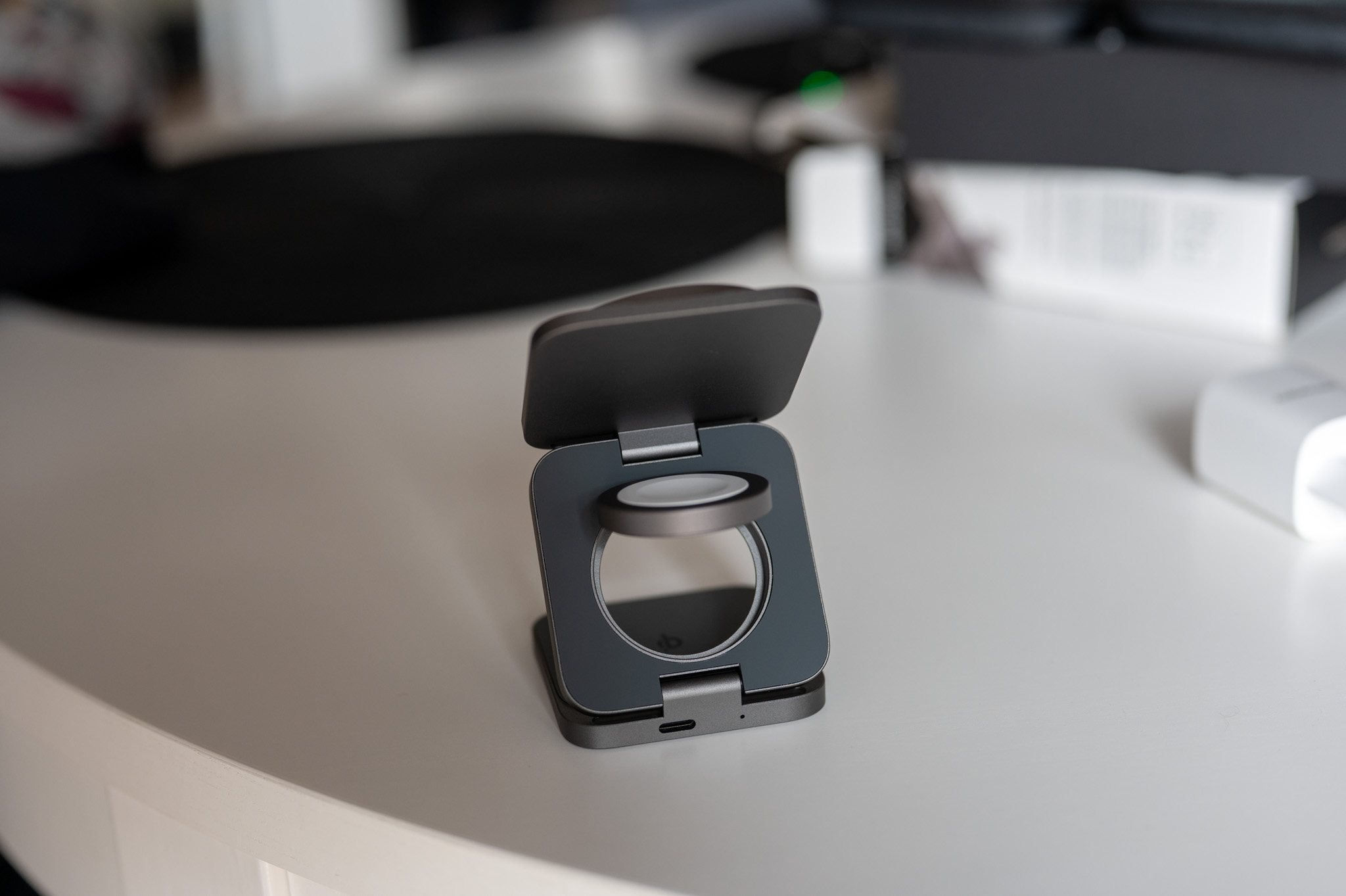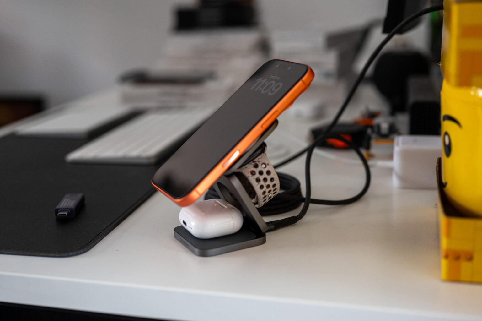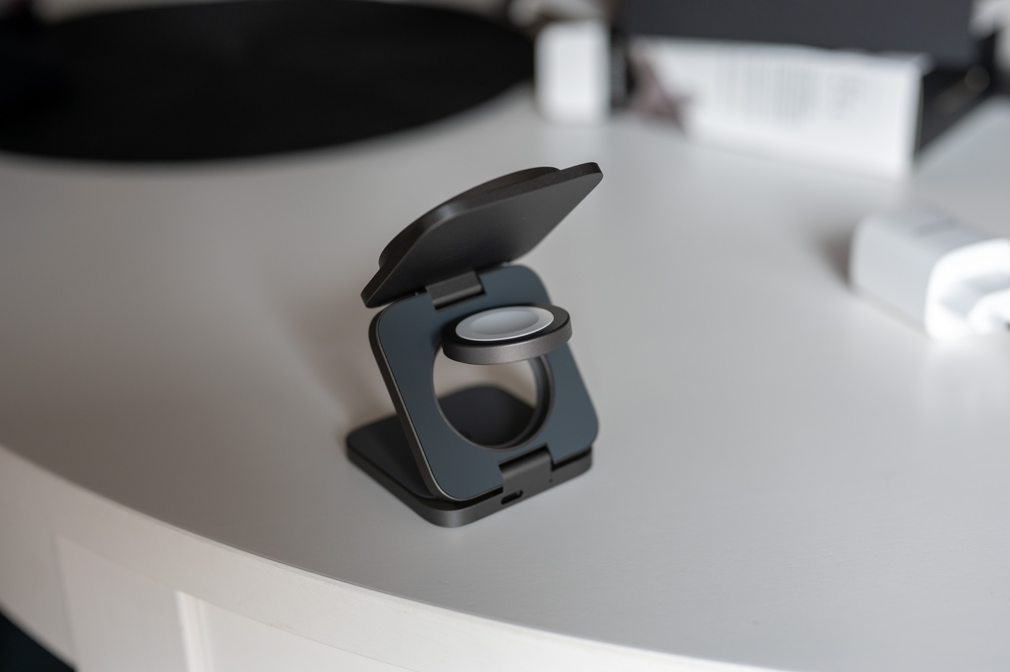 A jaká je tedy nabíječka v praxi? Největší rozdíl oproti klasickému nabíjení jsem pocítil v každodenní rutině. Přijdu domů, položím iPhone na stojánek, k tomu přicvaknu Apple Watch a odložím AirPods. Celé to zabere doslova dvě vteřiny a je to. Žádné lovení kabelů, žádné hledání volné nabíječky. A díky podpoře rychlonabíjení víte, že pokud potřebujete po návratu domů ještě někam odběhnout, stačí nechat vaše věci na nabíječce doslova pár minut a jsou „dokrmené“ na další hodiny používání.
