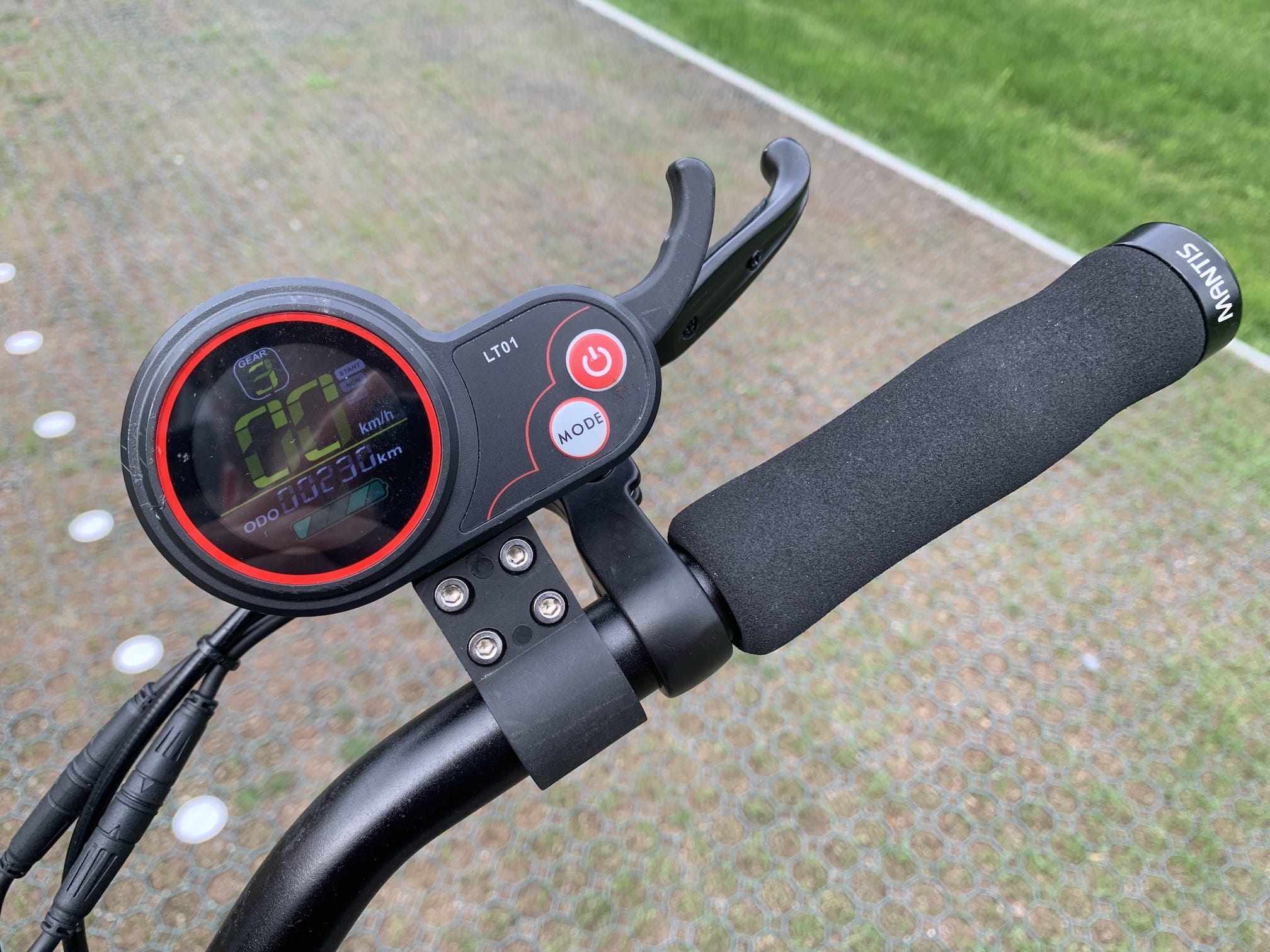 Když už jsme nakousli ta řídítka, tak u nich také zůstaneme. Řídítka jsou taktéž opravdu velmi důležitým prvkem, který musí být při rychlé jízdě co nejvíce stabilní. V mnohých elektrických koloběžek jsou řídítka velkou slabinou – u Mantis 10 se ale opravdu není čeho bát. Řídítka stačí pevně připevnit spojovacím kusem materiálu, který drží celkově čtyři imbusové šrouby. Na levé části řídítek se pak nachází „zapalování“ pro klíček, bez kterého koloběžka jednoduše nepojede, společně s ukazatelem napětí baterie a tlačítkem pro ovládání světel. Napravo pak najdete hlavní displej, na kterém si můžete zobrazit různé informace a data o jízdě. Nechybí dvě tlačítka – jedno pro zapnutí a vypnutí displeje, druhé pro změnu režimu rychlosti koloběžky. Samozřejmostí je pak páčka, pomocí které ovládáte výkon elektromotoru.
