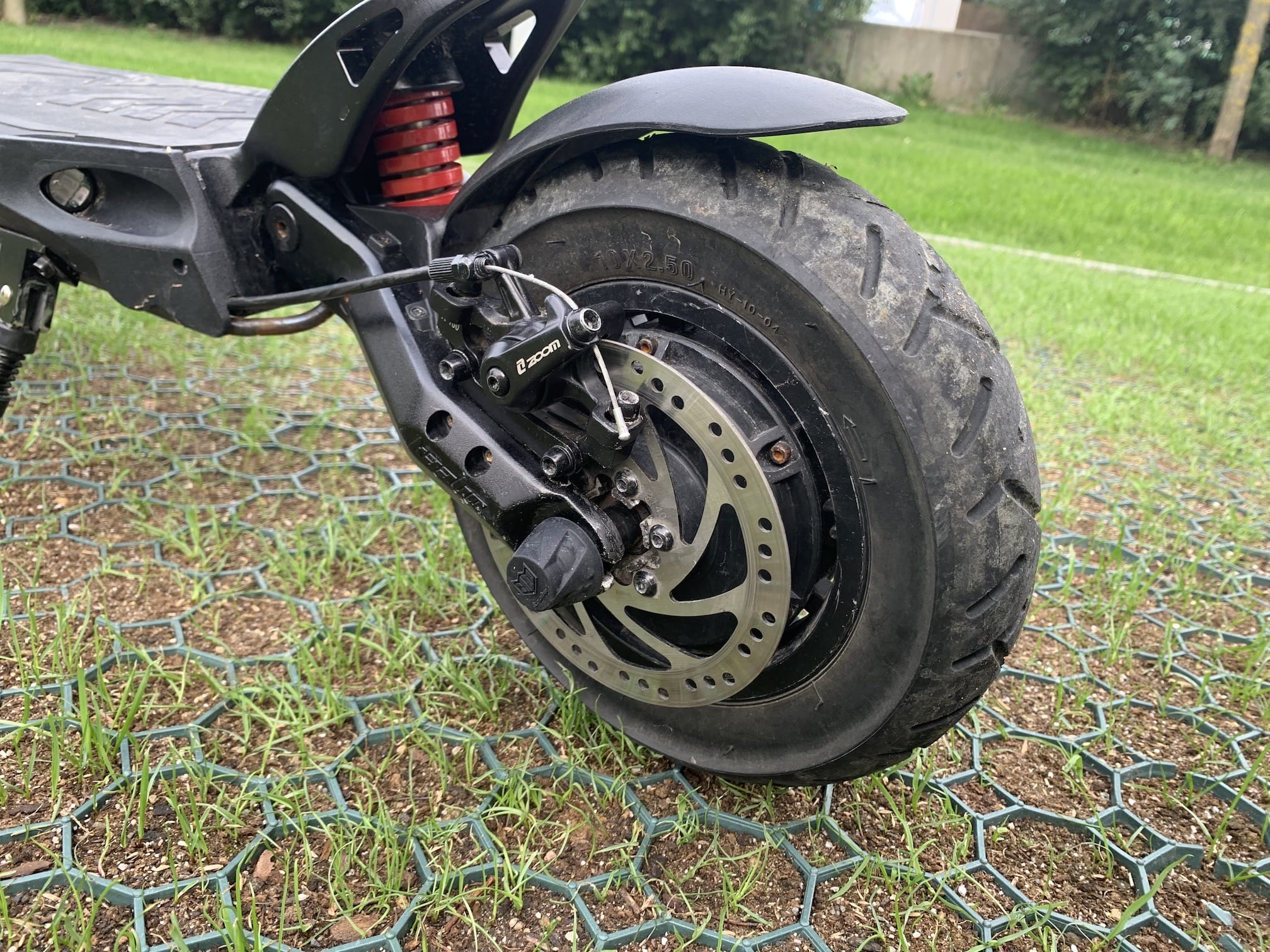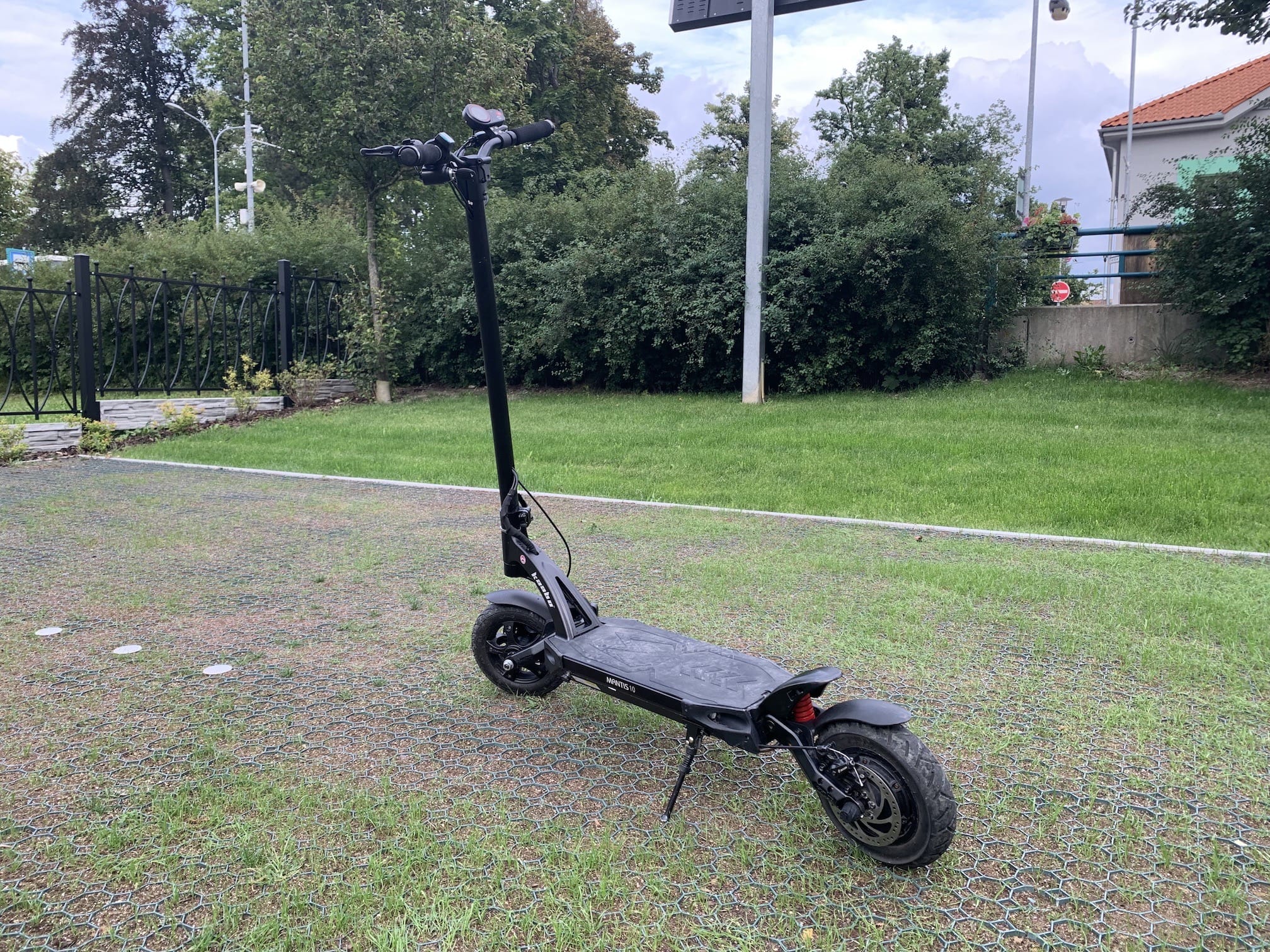 Poslední odstavec bych chtěl u zpracování věnovat „podvozku“. Již ze samotných fotek lze poznat, že odpružení je u elektrické koloběžky Mantis 10 na opravdu velmi dobré úrovni. Tento model konkrétně vepředu i vzadu využívá pružinové zavěšení, díky kterému jste schopni bez problémů a v relativním pohodlí jezdit i na horších cestách s dírami, popřípadě také offroad. Mantis 10 se dále chlubí masivními 10″ koly, které koloběžku spojují se zemí. A když máte u dopravního prostředku nějaký výkon, tak je samozřejmě nutné jej umět ubrzdit. Ani v tomhle ohledu se nemusíte ničeho bát, jelikož se vepředu i vzadu nachází 140mm kotouče, které kolos v podobě Mantis 10 zabrzdí velice jednoduše. Navíc k tomu je využívána také motorová brzda, kterou navíc dochází k rekuperaci energie – tu pak můžete využít pro boost.