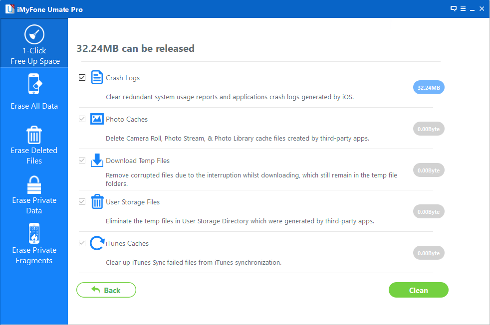 Poslední možností, kterou iMyFone Umate Pro nabízí, je odstranění datových fragmentů po nainstalovaných a smazaných aplikací třetích stran. Jedná se v podstatě o jakousi defragmentaci disku, kdy program projede vaše zařízení a odstraní všechna přebytečná data, která zde zůstala po dříve nainstalovaných aplikacích. Tato funkce je tak podobná klasickému uvolnění místa na vašem zařízení, které Umate Pro také nabízí.