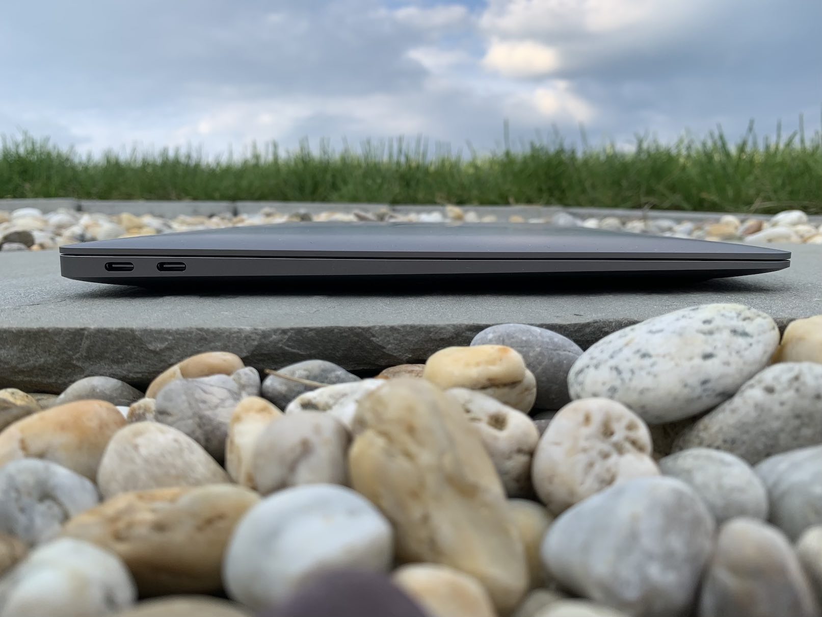 Pokud se podíváme na vzhled MacBooku Air 2020, tak lze tvrdit, že naprosto perfektně zapadá mezi ostatní současné MacBooky. Oproti MacBookům Pro však nabízí Air kromě vesmírně šedého a stříbrného zbarvení také zlatou barvu, což ocení především dívky a ženy. Překvapí vás samozřejmě klasické hliníkové šasi, na které Apple vsází již po dobu několika dlouhých let. U většiny konkurence není hliníkové šasi vůbec standardem a pokud byste se podívali na jiné stroje ve stejné cenové hladině, tak byste zjistili, že se mnoho výrobců nebojí i nadále používat klasický plast – ten jednak není tak odolný a jednak se nejedná o vůbec elegantní řešení. Pokud se podíváte na Air seshora, tak nemáte prakticky šanci jej rozeznat oproti 13″ MacBooku Pro. Největší rozdíl v designu přichází, když se na MacBook Air podíváte ze strany. Prakticky ihned vás doslova zarazí jeho výška, která se směrem od vzdálenějšího konce směrem k tomu bližšímu ještě zužuje. Abychom byli naprosto přesní, tak výška MacBooku Air začíná na 1,61 centimetrech, směrem dopředu poté dochází ke zúžení na úctyhodných 0,41 centimetru. Co se týče dalších mír, tedy šířky a hloubky, tak se jedná o 30,41 centimetrů a 21,24 centimetrů. Velkým lákadlem MacBooků Air byla vždy jednoduchá přenositelnost společně s nízkou váhou – a ani v tomto případě nedošlo k žádnému pochybení. MacBook Air 2020 váží necelých 1,3 kg – v batohu na zádech jej tedy snad ani nepoznáte.