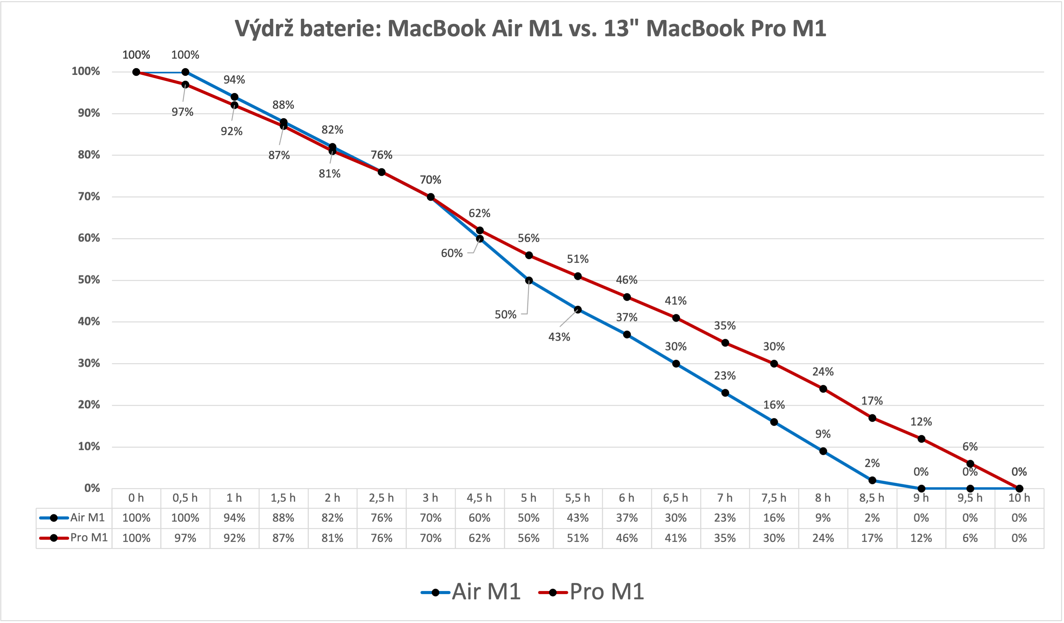 Ještě než se podíváme na výsledky našeho testování, tak bych rád dodal, že i přesto je výdrž dle mého názoru perfektní. Zařízení je totiž schopné fungovat po celý den a já se tak na něj mohu při práci vždy spolehnout. Náš test poté vypadal tak, že jsme měli MacBook Air připojený k 5GHz Wi-Fi síti s aktivním Bluetooth a jasem nastaveným na maximální hodnotu (automatická úprava jasu i funkce TrueTone byly vypnuty). Následně jsme na Netflixu nechali streamovat oblíbený seriál La Casa De Papel a co půlhodinu stav baterie kontrolovali. Za 8,5 hodiny byla baterie na 2 procentech.