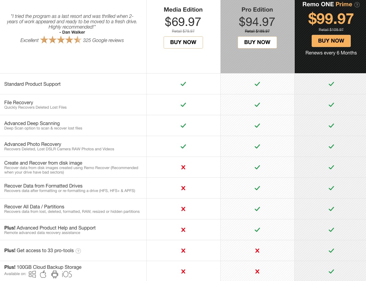 Pokud hledáte ten nejlepší program, který je specializovaný na obnovit ztracených a zničených fotek či videí, tak jste právě narazili na zlatý důl. Remo Mac Photo Recovery vám mohu jen a jen doporučit, a to z dlouhodobé vlastní zkušenosti. A pokud by se vám něco nedařilo, tak je podpora Remo Mac Photo Recovery připravena pomoci 24 hodin denně a 7 dní v týdnu. Remo Mac Photo Recovery je v trial verzi k dispozici zdarma, poté si jej musíte zakoupit, a to v rámci dostupných balíčků. Remo Mac Photo Recovery je k dispozici v Media Edici za 69.97 dolarů, v Pro Edici poté za 94.97 dolarů a v Remo ONE Prime edici za 99.97 dolarů. Rozdíly v edicích naleznete v obrázku pod tímto článkem.