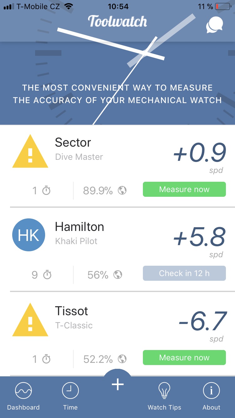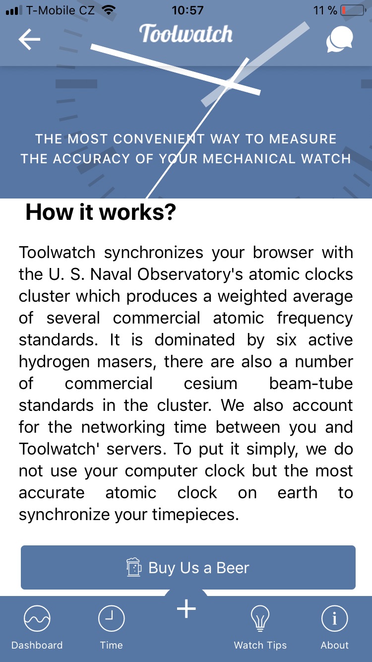 V dnešní krátké recenzi se podíváme na aplikaci s názvem Toolwatch. Jak již název napovídá, jedná se o velmi šikovnou pomůcku, která se bude hodit každému majiteli automatických (nebo mechanických) hodinek. Cílem aplikace je poskytnout majiteli hodinek informace o tom, jak je jejich stroj přesný, a to na základě kontrolních měření, která probíhají ve srovnání s atomovými hodinami.