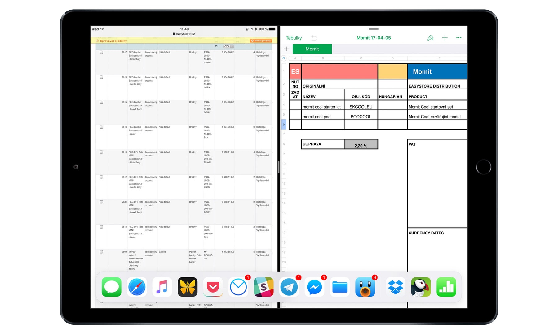 Ve druhém případě jsem zkusil přes celou plochu nechat roztažené Magento a gestem jsem přeskočil do aplikace Numbers. Na první pohled se může zdát, že je to podobné jako rozdělit obrazovku napůl. Výhoda je však lepší orientace po displeji a závěrem i rychlejší práce. Když si pomůžete známou zkratkou z Macu (CMD+TAB), přeskočíte mezi aplikacemi velmi snadno. Jde to i čtyřmi prsty po displeji, ale pokud pracujete se Smart Keyboard, klávesová zkratka prostě vítězí.