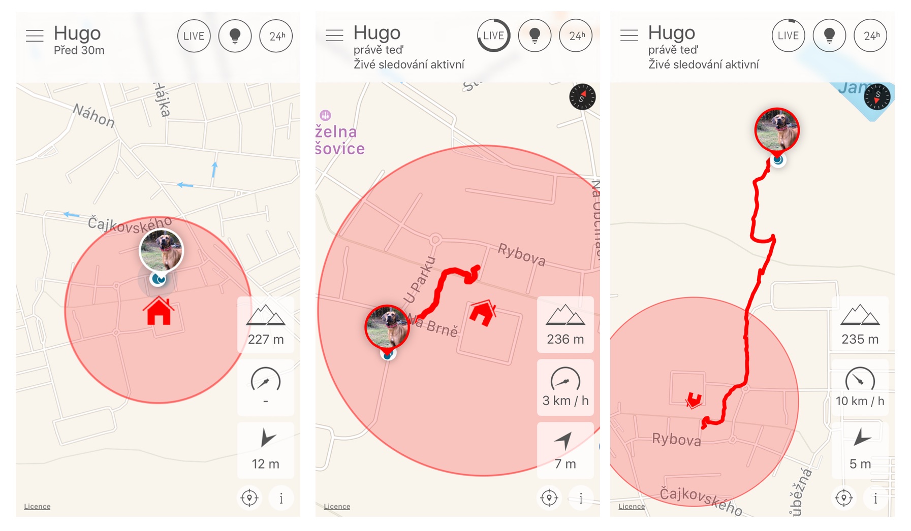 V praxi to vypadá tak, že na mapě v aplikaci Tractive vidíte červenou čáru, kterou živě kreslí ikona s fotografií vašeho psa. Snadno jsme tak zjistili, kde se Hugo nachází, i když jsme ho už třeba okem neviděli. V případě, že by se zaběhl někam daleko a nezvládl se vrátit, dokážete ho pomocí Live Trackingu snadno vystopovat.