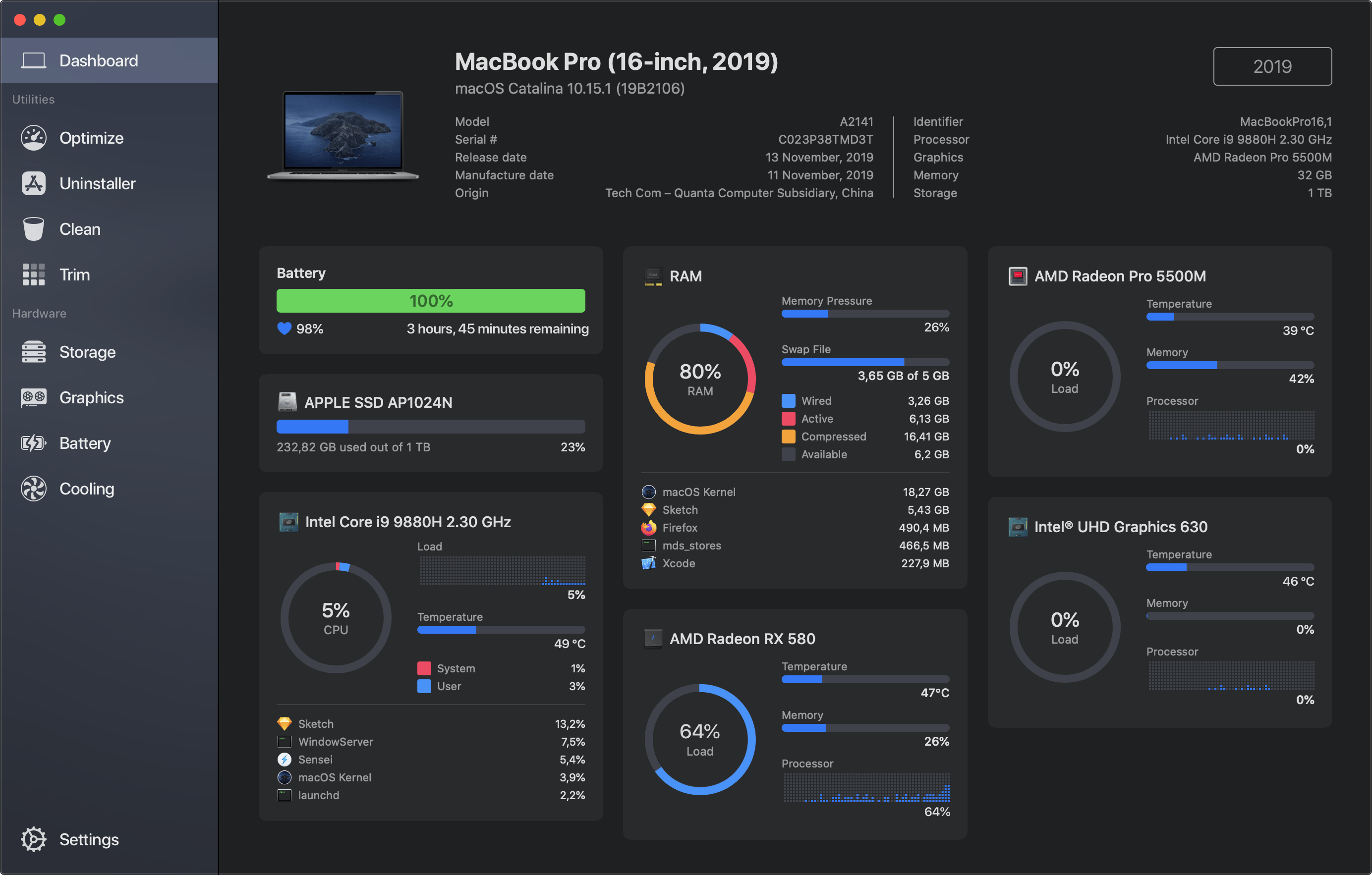 Po prvním spuštění aplikace Sensei je nutné, ostatně jako u prakticky každé jiné aplikace, abyste jí povolili přístup k různým službám. Prvně bylo nutné nainstalovat rozšiřující balíček, a poté povolit přístup k datům na disku. Po provedení těchto úkonů už se ocitnete na perfektně zpracovaném přehledu vašeho zařízení – jedná se o první položku v menu s názvem Dashboard. Zde naleznete souhrn nejzajímavějších dat o vašem Macu. Konkrétně se jedná o kompletní specifikace, tedy například modelové označení, sériové číslo, datum výroby a další. Níže se pak v blocích nachází informace o stavu baterie a SSD, nechybí ani vyobrazení zatížení procesoru, grafického akcelerátoru a paměti RAM.