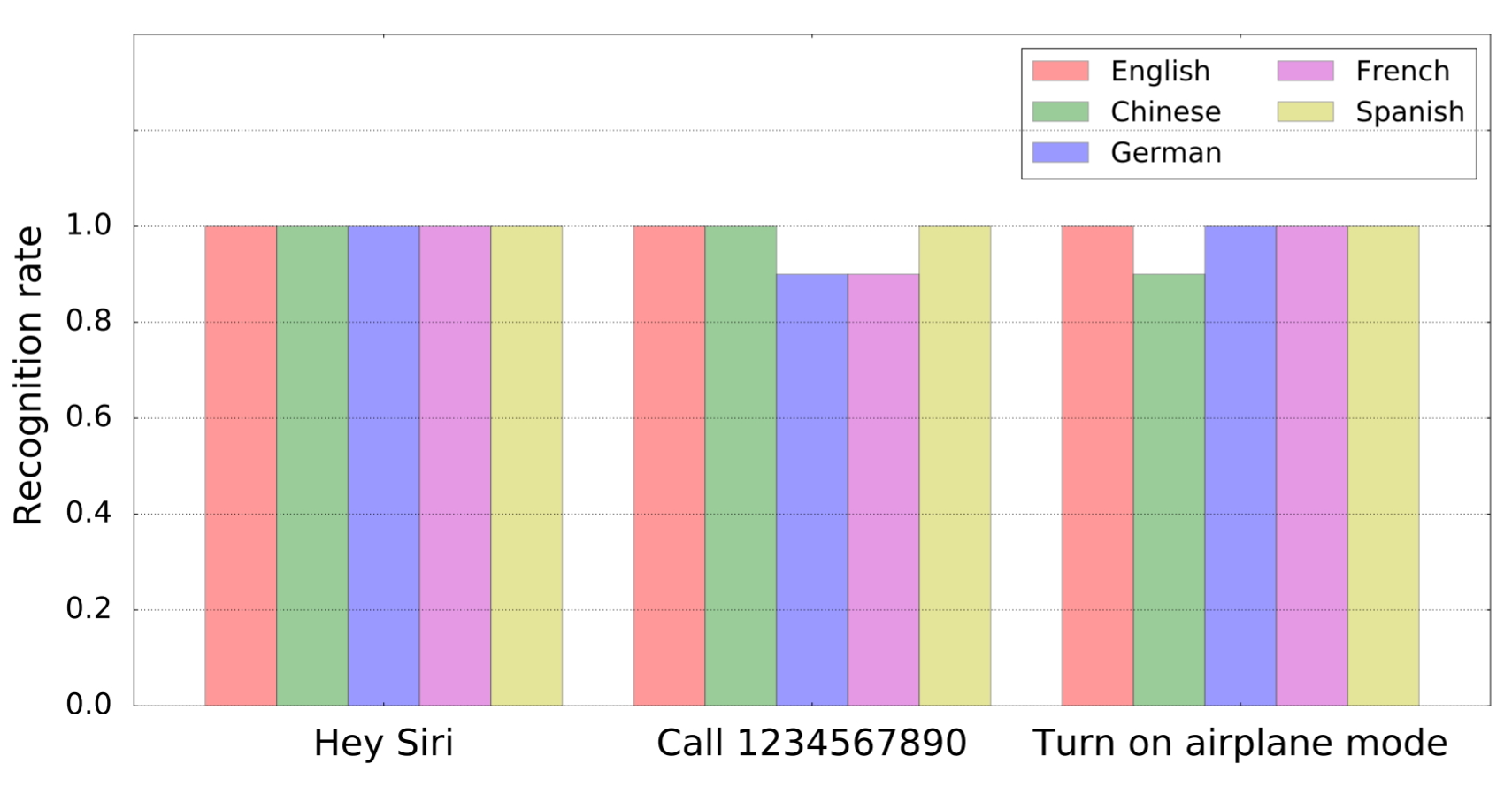 V rámci výzkumu se ukázalo, že na takto upravené příkazy reagují v podstatě všechny asistentky na trhu. Ať už jde o Siri, Alexu, Google Assistant nebo Samsung S Voice. Na výsledek testu nemělo vliv zařízení, které bylo testované. Reakce asistentů se tedy dostavila jak z telefonu, tak z tabletu či počítače. Konkrétně byly testovány iPhony, iPady, MacBooky, Google Nexus 7, Amazon Echo a dokonce i Audi Q3. Celkem tak šlo o 16 zařízení a 7 různých systémů. Ultrazvukové příkazy zaregistrovali všichni. Co je možná ještě strašidelnější je fakt, že takto upravené (a pro lidské ucho neslyšitelné) příkazy byly rozpoznány také funkcí pro rozpoznání řeči.