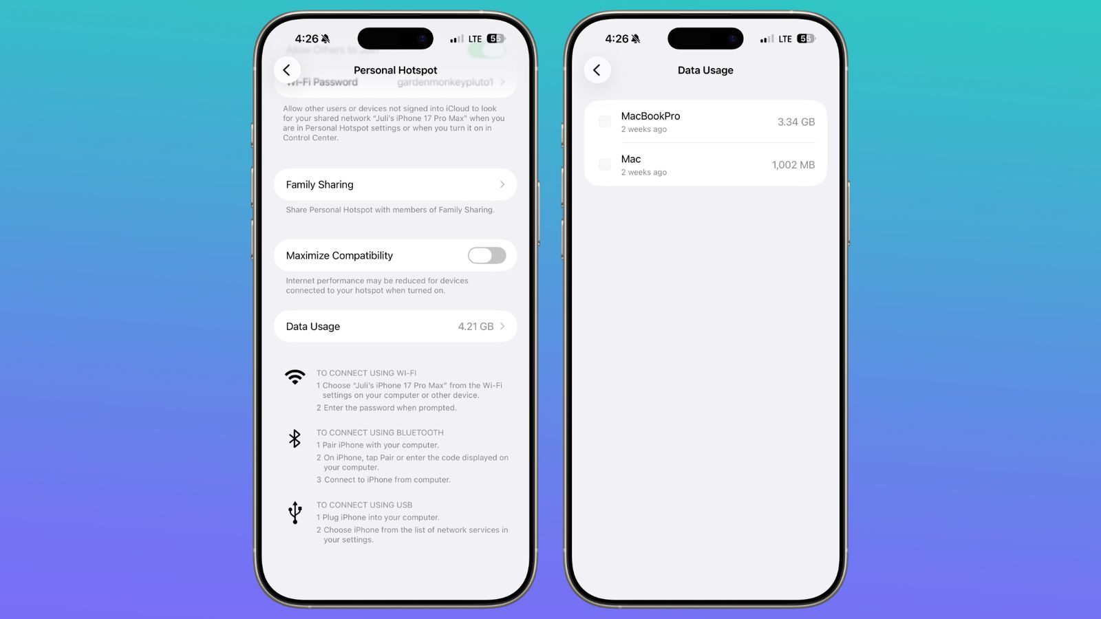 - Osobní hotspot: Apple změnil umístění údajů o využití dat přes osobní hotspot. Místo toho, aby byly tyto statistiky schované hluboko v sekci Mobilní data, uvidíte objem přenesených dat přímo v hlavní nabídce Osobní hotspot.