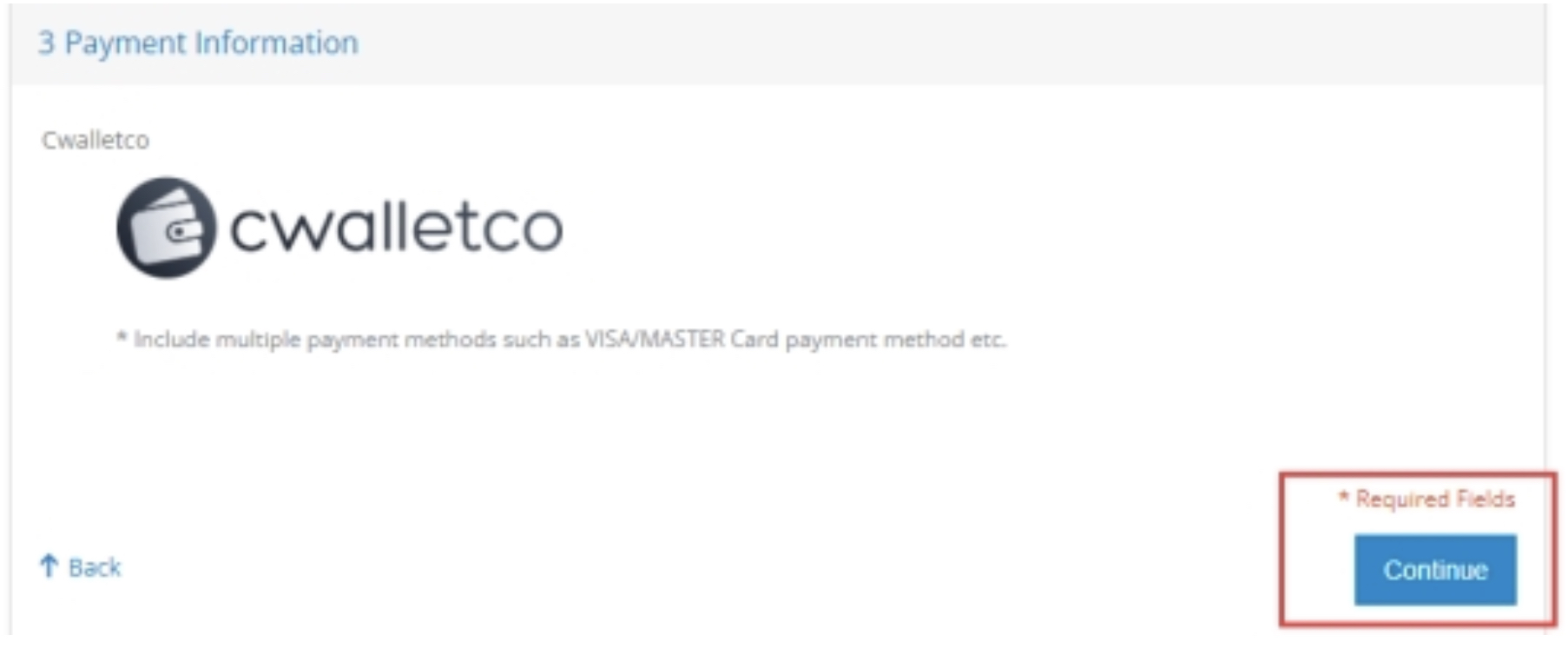 2. V tomto kroku vyberte možnost „CWALLETCO“ a klikněte na tlačítko „Pokračovat“.