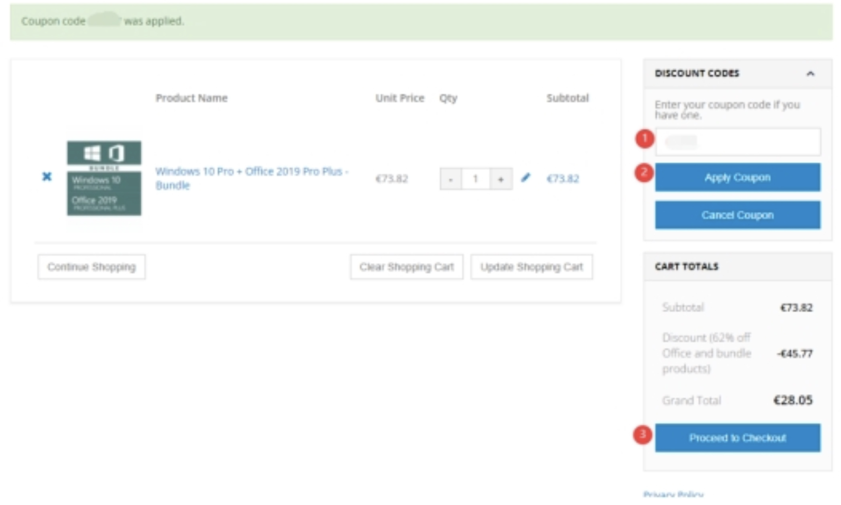 1. Přidejte produkt do nákupního košíku a vyplňte kód kupónu, po potvrzení klikněte na „Proceed To Checkout“!