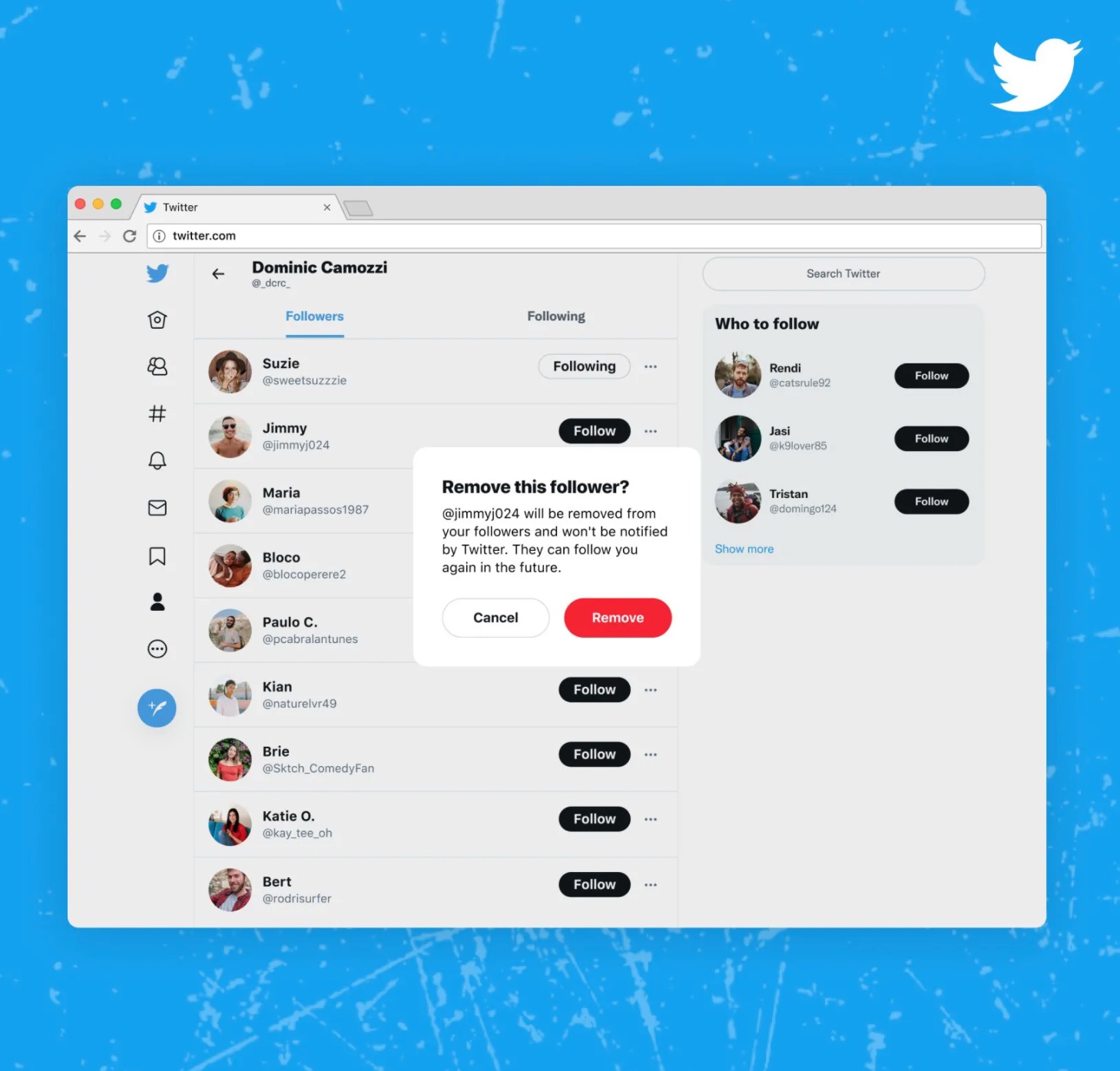 Zahájení testování zmíněné funkce bylo oznámeno v jednom z oficiálních twitterových příspěvků. Odstranění vybraného účtu ze seznamu sledujících by podle přiloženého screenshotu mělo být velmi rychlé a jednoduché. Postačí kliknout na ikonku tří teček napravo do vybraného účtu a zvolit jeho odstranění. Z oznámení na screenshotu dále také vyplývá, že dotyčný se o tom, že byl odstraněn ze seznamu sledujících, nedozví – respektive na tuto skutečnost nebude upozorněn notififikací. Pokud si ale odstranění všimne sám a bude chtít daný účet opět začít sledovat, může tak učinit. Jedná se o jakousi „něžnější“ variantu klasické blokace, při které dotyčný přijde o možnost číst tweety vybraného účtu a zasílat jeho tvůrci soukromé zprávy.