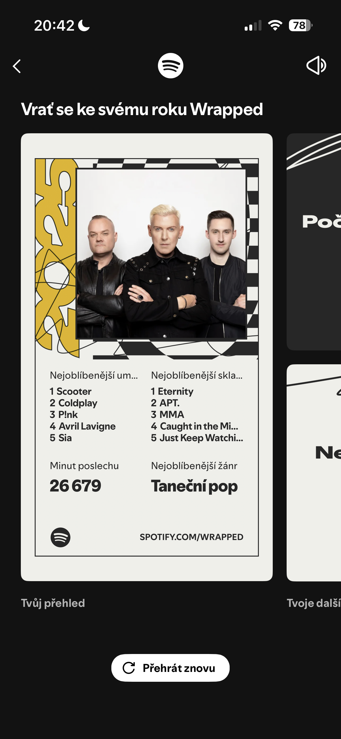 Každoroční přehled poslechů se stal tradicí napříč všemi hlavními hudebními platformami. Po včerejším spuštění Apple Music Replay 2025 a po YouTube přišel dnes i Spotify Wrapped 2025. Letos však kromě obvyklého souhrnu nabízí zcela novou interaktivní funkci v podobě Wrapped Party. Základ tvoří přehled Your 2025 Wrapped, v němž uživatel nalezne své nejčastěji přehrávané skladby, alba a interprety. Nechybí ani tlačítko „Vaše příběhy“, které zpracuje celý souhrn do animované prezentace. Spotify také zveřejnilo globální žebříček pěti nejpopulárnějších interpretů roku, jimiž jsou Bad Bunny, Taylor Swift, The Weeknd, Drake a Billie Eilish.