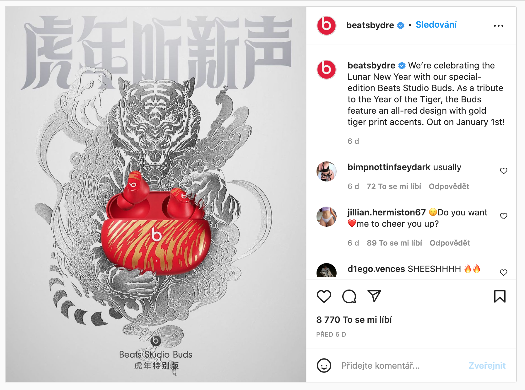 Nejen AirPody ale i sluchátka Beats se dočkala speciální edice, ve které hraje hlavní roli nový rok a Tygr. Červené Beats Studio Buds tak přicházejí se zlatými doplňky, které odrážejí podobu této kočkovité šelmy.