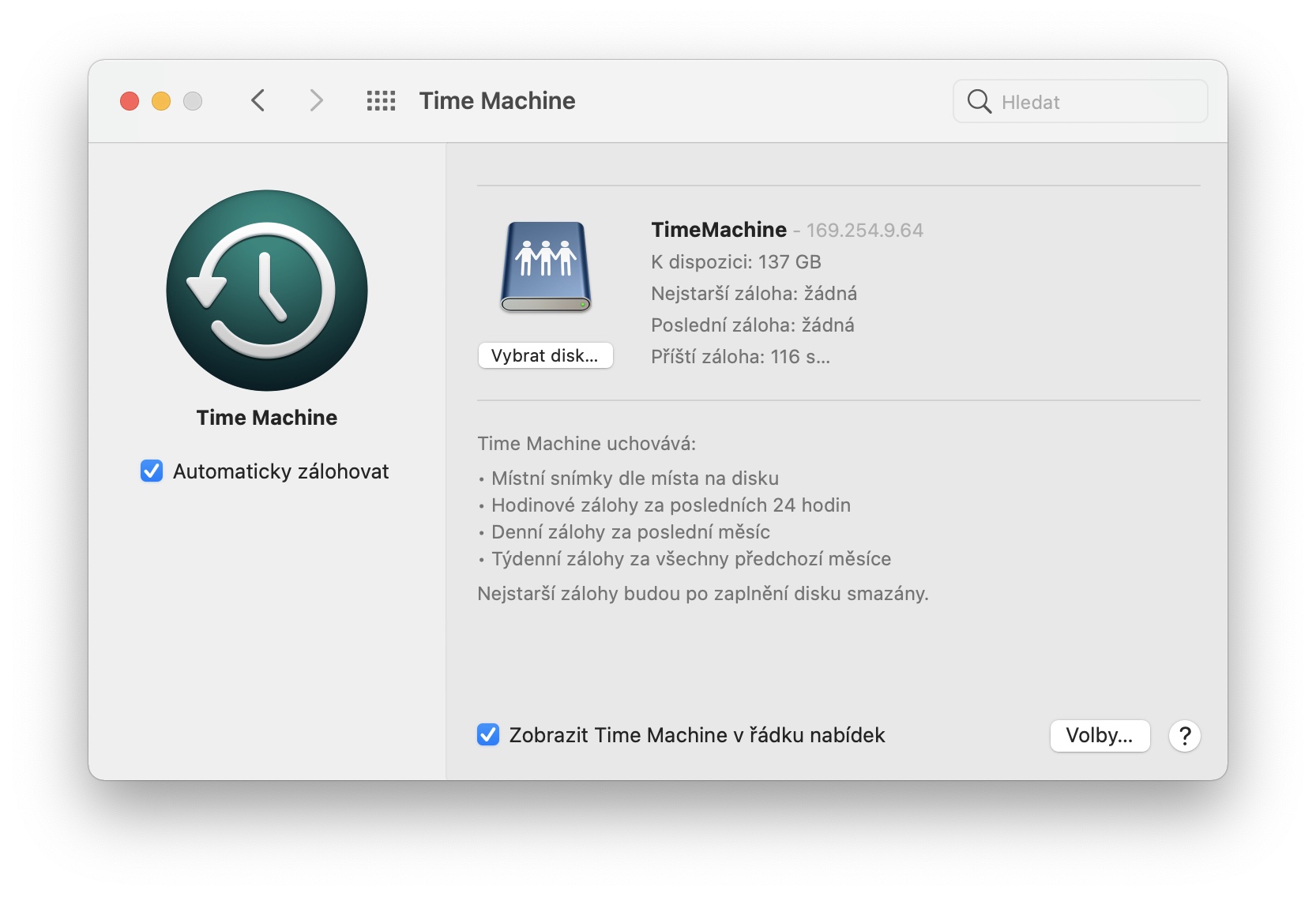 Zároveň je na místě zmínit, jak často Time Machine vlastně zařízení zálohuje. Aby utilita nabídla co možná nejlepší pokrytí, vytváří hodinové zálohy za posledních 24 hodin, denní zálohy za poslední měsíc a týdenní zálohy za všechny uplynulé měsíce. Pokud by náhodou došlo k zaplnění daného disku, funkce začne automaticky mazat nejstarší zálohy ve prospěch těch nejnovějších. Takto alespoň funguje takzvané automatické zálohování. Na druhou stranu ale nechybí ani možnost pro ruční zálohování. Pokud byste chtěli Time Machine spustit ručně, bez čekání, stačí v horní nabídce menu bar klepnout na ikonku Time Machine a potvrdit volbu tlačítkem Zálohovat.