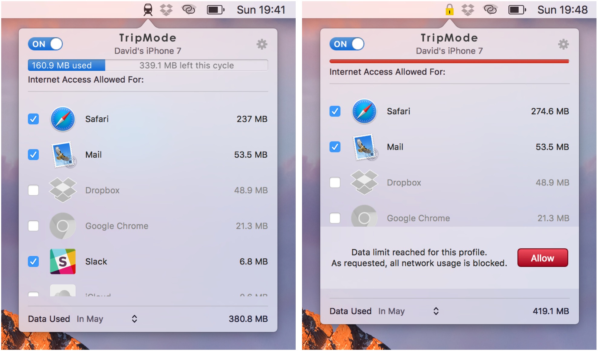 Rozhraní TripMode 2 bylo uhlazeno a vývojáři přepsali také většinu enginu, aby vylepšili běh a stabilitu celé aplikace. V ní můžete nadále snadno sledovat, která aplikace snědla kolik dat a jediným kliknutím ji povolit/zakázat přístup k internetu. Někteří uživatelé jistě dokáží využít TripMode 2 nejen pro ochranu datového limitu, ale také lze díky němu záměrně „vypínat“ Twitter a další komunikátory, když se potřebujete soustředit na práci a nechcete být neustále rozptylováni.