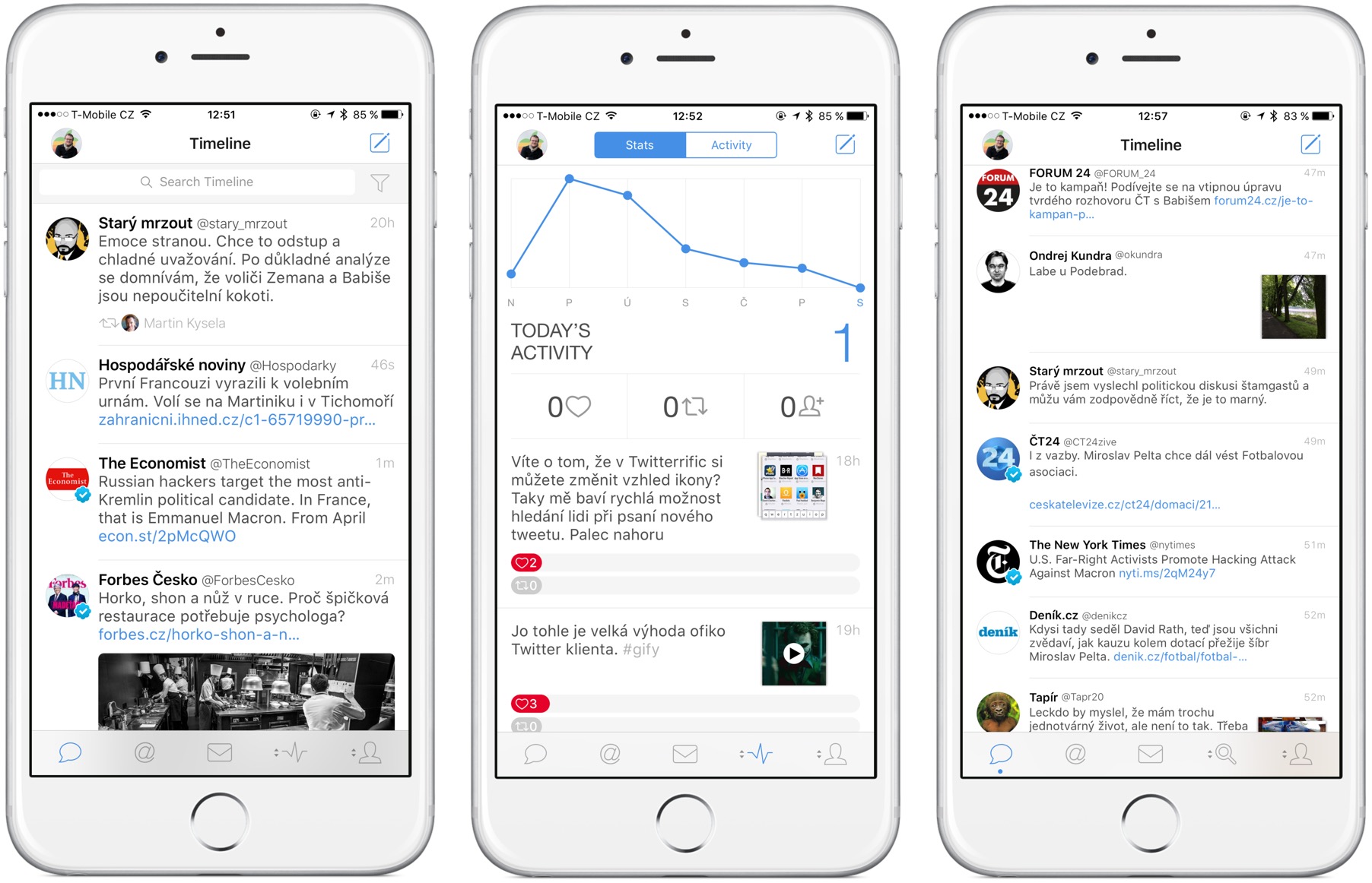 Také s Twitterrificem mám svou historii, a tak to pro mě nebyla novinka, nicméně jsem ji dlouho nepoužíval. Viticci mě ovšem navnadil natolik, že jsem si Twitterrific do iPhonu po letech opět stáhl a začal ji znovu používat. A rovnou jsem ji pak srovnal se zkušeností z oficiální aplikace Twitter a zmíněného Tweetbotu, který většina považuje za to nejlepší, čím můžete Twitter číst. Během svého testování jsem nicméně přišel na to, že i opěvovaná aplikace od Tapbots má své limity. Je ale vůbec reálné používat na jedinou sociální síť tři aplikace najednou?
