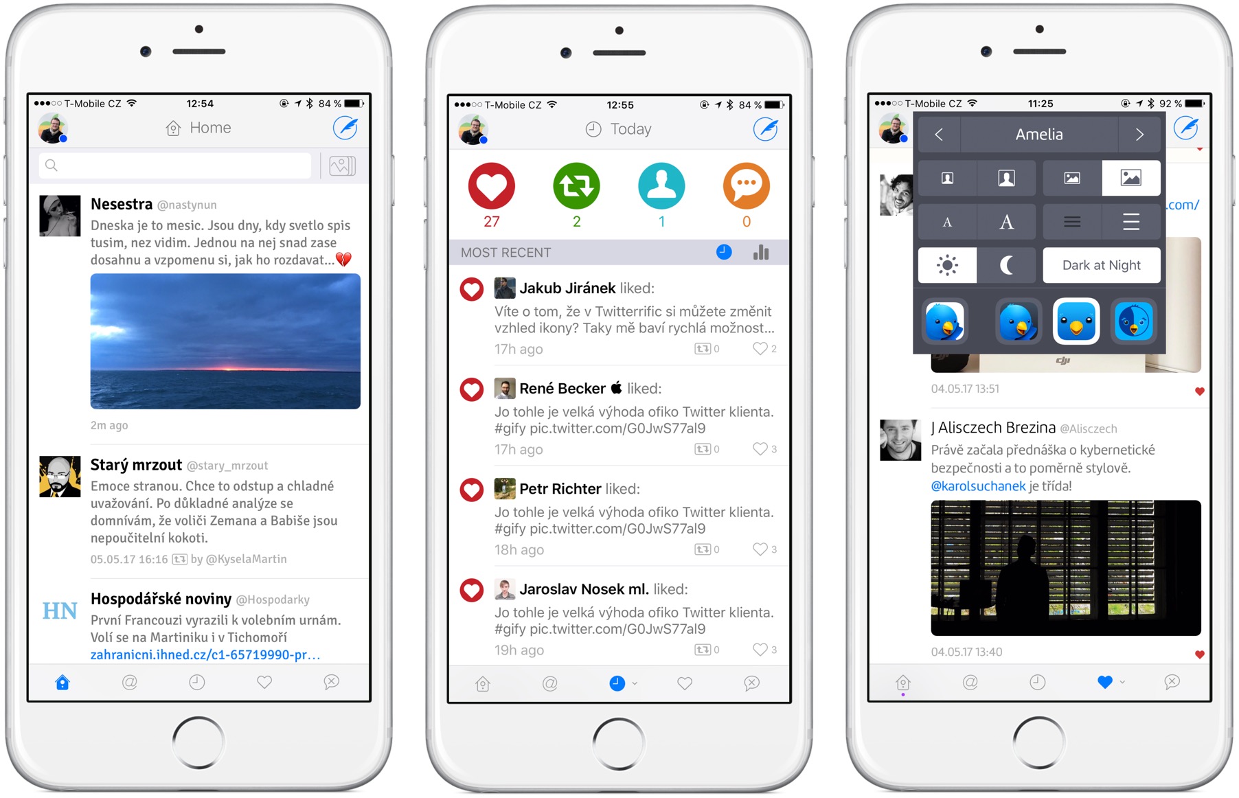 Vzhledem k možnostem konkurenčních aplikací mě uchvátilo již zmíněné uživatelské na stavení. Na výběr máte hned devět fontů, díky kterým si můžete změnit písmo napříč aplikací. Měnit také můžete velikost avatarů u jednotlivých uživatelů, obrázky, písmo, řádkování a v neposlední řadě i samotnou ikonku aplikace, což Apple spustil teprve nedávno. Twitterrific má také noční režim, ale na rozdíl od Twitteru ho umí spustit automaticky se soumrakem, nebo ho ručně zapnete přejetím dvěma prsty po obrazovce ze strany na stranu.