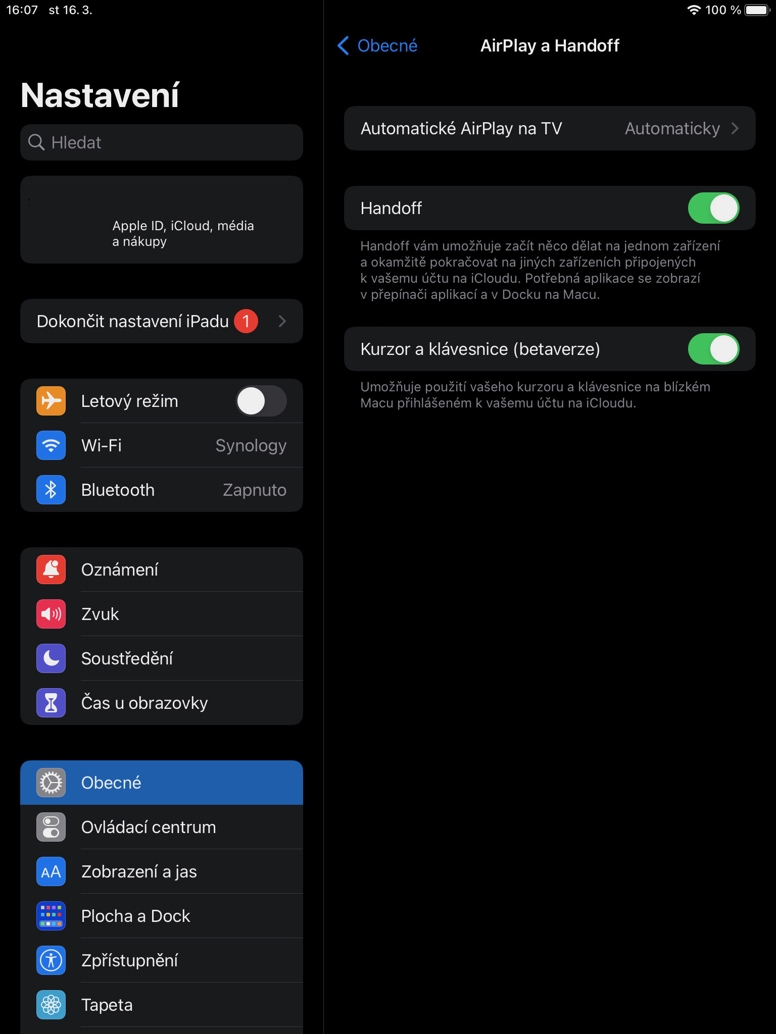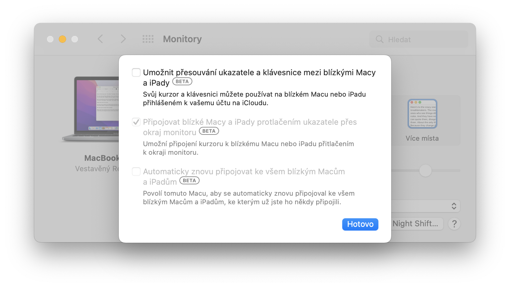 V macOS musíte jít do Předvolby systému -> Monitory -> Společné ovládání, kde je třeba zaškrtnout volbu Umožnit přesouvání ukazatele a klávesnice mezi blízkými Macy a iPady. Následně můžete blíže definovat chování kurzoru, jestli jej chcete jakoby „protlačit“ přes okraj, nebo to má probíhat plynule jako v případě, kdy používáte více monitorů. Pak si zde můžete zapnout ještě možnost automatického opětovného připojování. Na iPadu jděte do Nastavení -> AirPlay a Handoff, kde zapnete možnost Kurzor a klávesnice (betaverze).