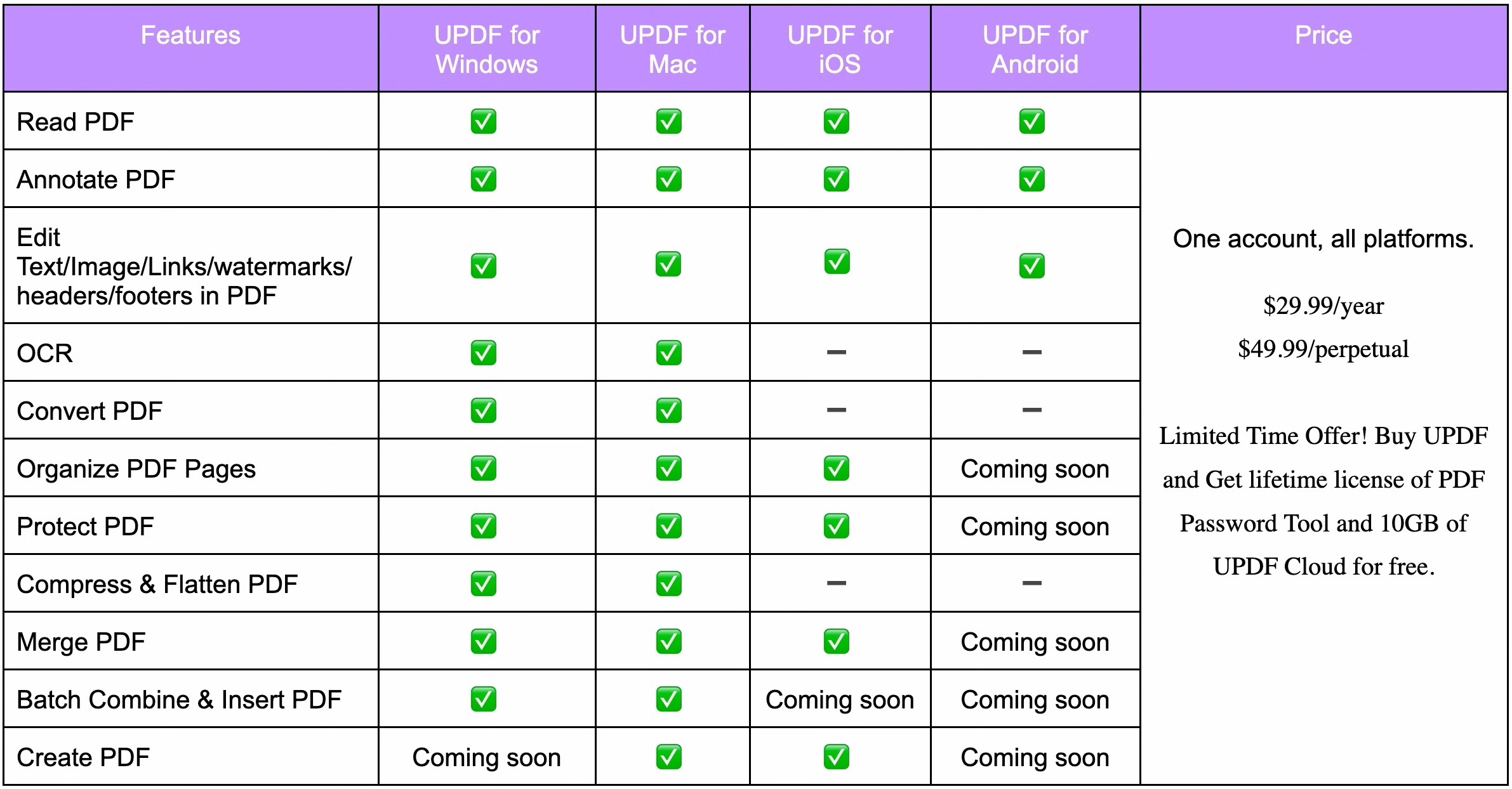 A konečně, jedním z hlavních důvodů, proč doporučuji UPDF, je jeho cenový model a to, jakou hodnotu z něj v porovnání s ostatními získáte. UPDF stojí 29,99 dolaru ročně, nebo můžete získat doživotní licenci za 49,99 dolaru. Tato licence vám také umožní přístup ke všem vašim zařízením. Pak máte PDF Expert za 80 dolarů ročně a nakonec máte Adobe, která stojí 240 dolarů ročně!
