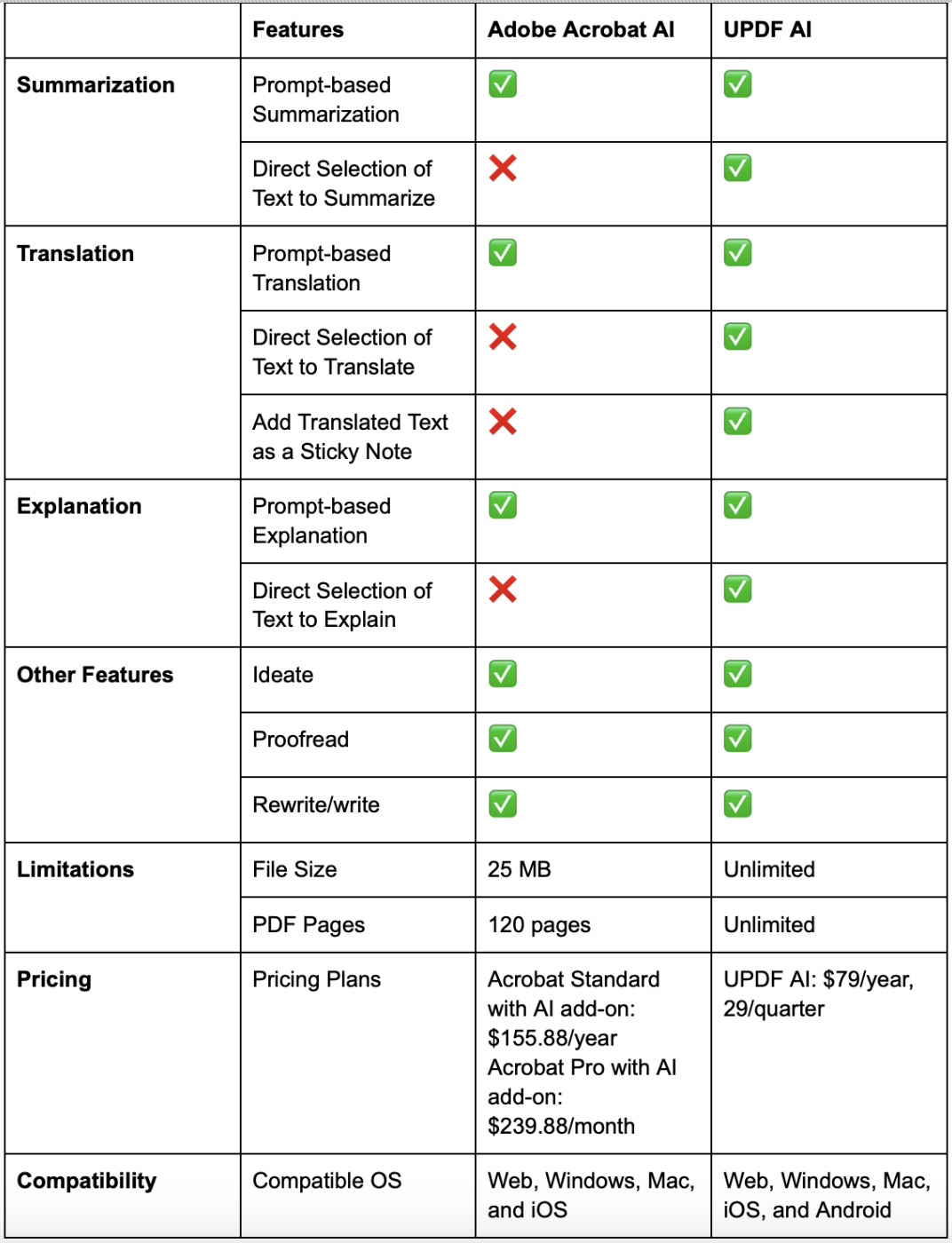 Existuje mnoho nástrojů umělé inteligence a přibývají další a další nástroje umělé inteligence pro soubory PDF. Typickým příkladem je Acrobat AI. Provedl jsem také jednoduché srovnání UPDF AI a Acrobat AI. Srovnávací analýzu naleznete v níže uvedeném grafu.