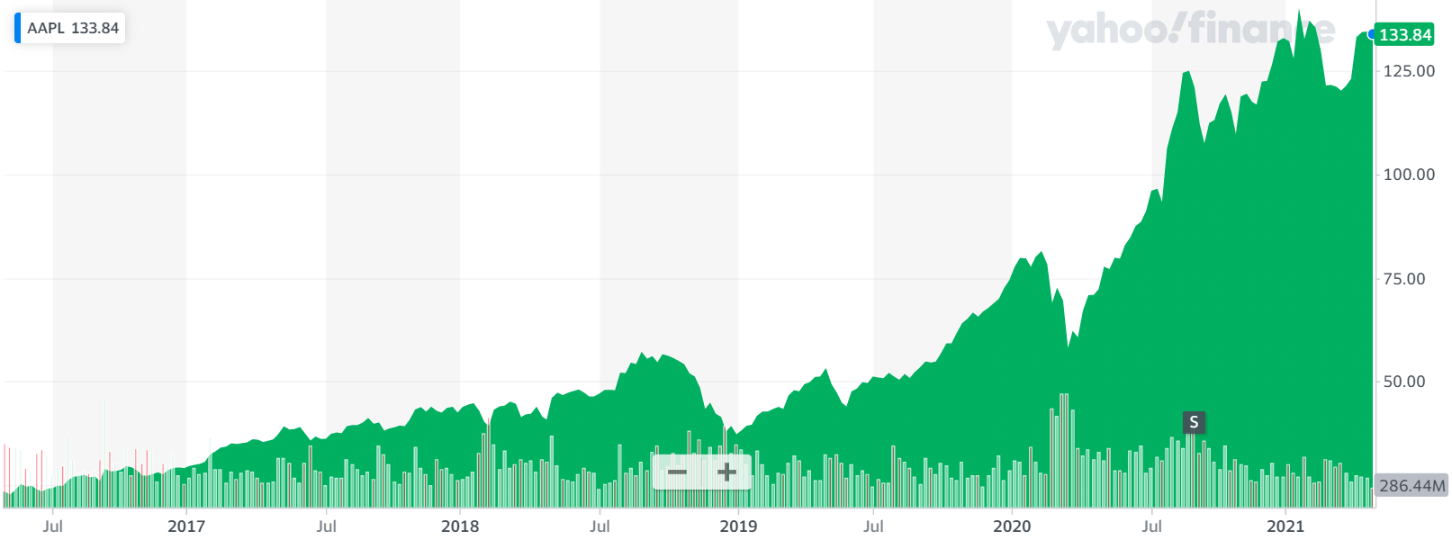 Apple také ve středu oznámil, že odkoupí vlastní akcie v hodnotě 90 miliard dolarů, což je dobrá zpráva pro investory. Protože se sníží objem dostupných akcií v oběhu, měla by při konstantní poptávce jejich cena růst. Pozitivní odezva investorské obce se hned projevila na akciovém trhu, když cena akcií Apple vyrostla o pár procent vzhůru. To ovšem není u akcií Apple nic nového, podívejte se níže, jak vypadá graf jejich ceny za posledních 5 let.