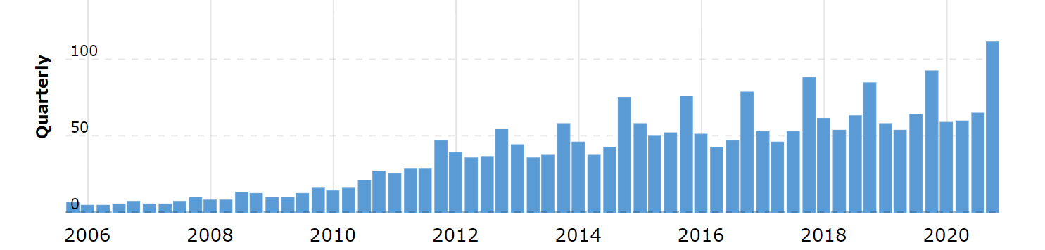 Tržby společnosti Apple za jednotlivá čtvrtletí v letech 2006–2020 v miliardách dolarů. Zdroj: Macrotrends.net