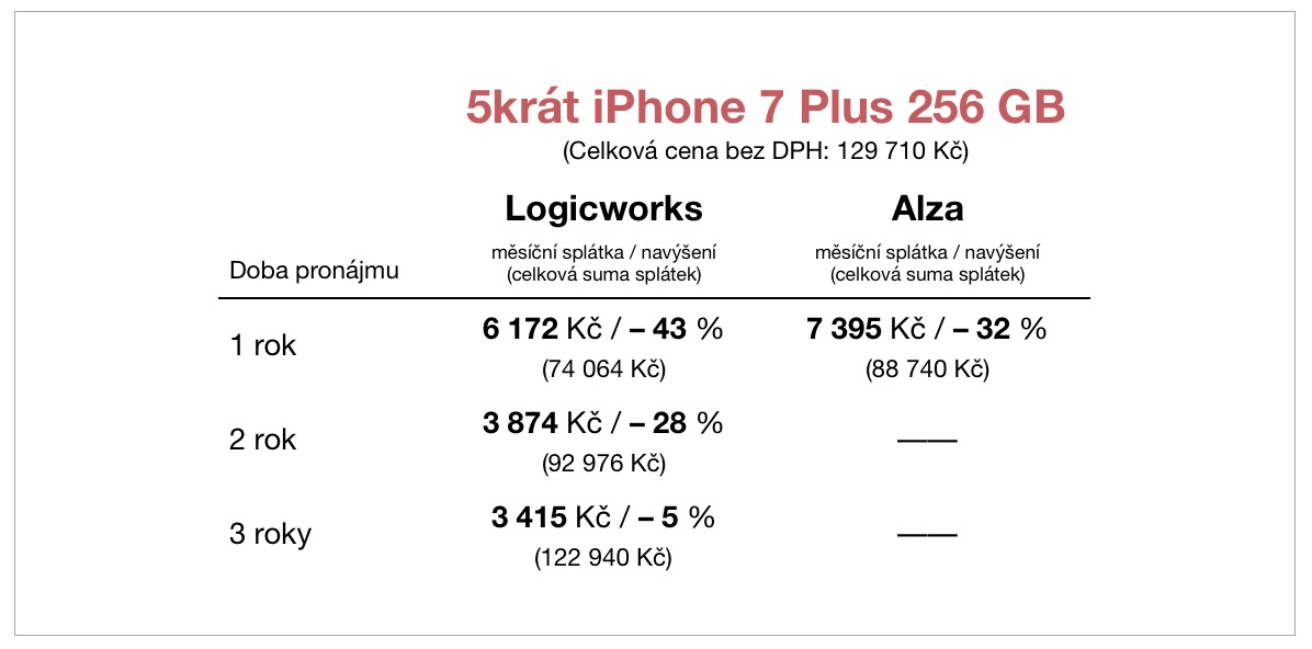 U Logicworks si tak sice nemůžete jako například u Alzy vzít do pronájmu jen jeden iPhone, na druhou stranu ale v případě pěti iPhonů 7 Plus 256GB se již při operativním leasingu dostanete na výhodnější podmínky (viz tabulka níže). Alza navíc u jablečných telefonů nabízí operativní leasing maximálně na jeden rok, Logicworks až na tři.