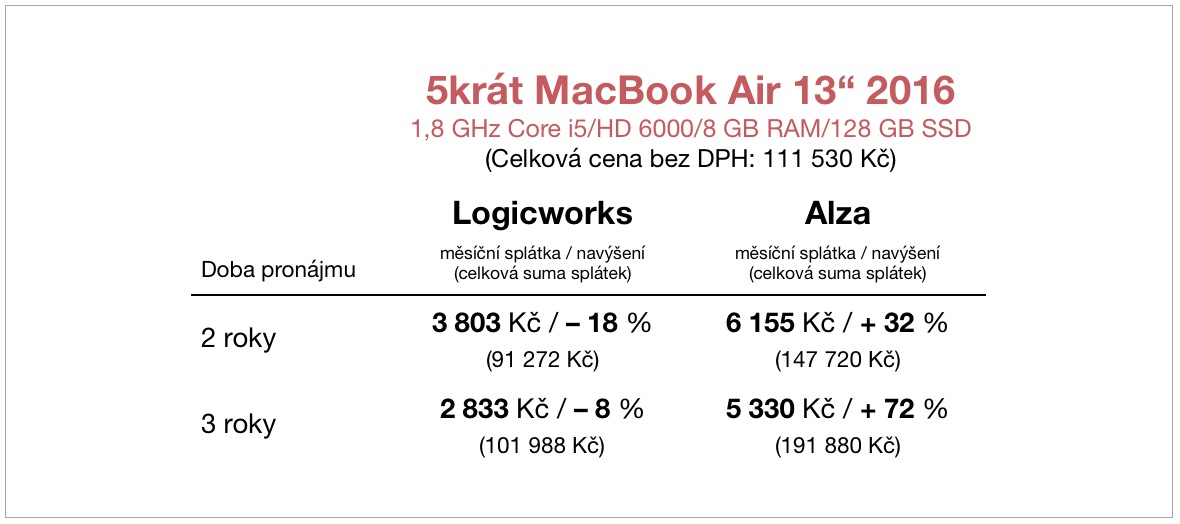 Zcela zásadní rozdíly pak najdeme v nabídce obou zmiňovaných firem u pronájmu MacBooků. Populární 13palcový MacBook Air z roku 2016 (konfigurace viz tabulka níže) vás v případě alespoň pěti kusů vyjde v rámci operativního leasingu významně levněji u Logicworks, kteří sestavují cenu na míru podle počtu zařízení, zatímco Alza má ceny pevně stanovené pro jeden kus a následně se jen násobí.